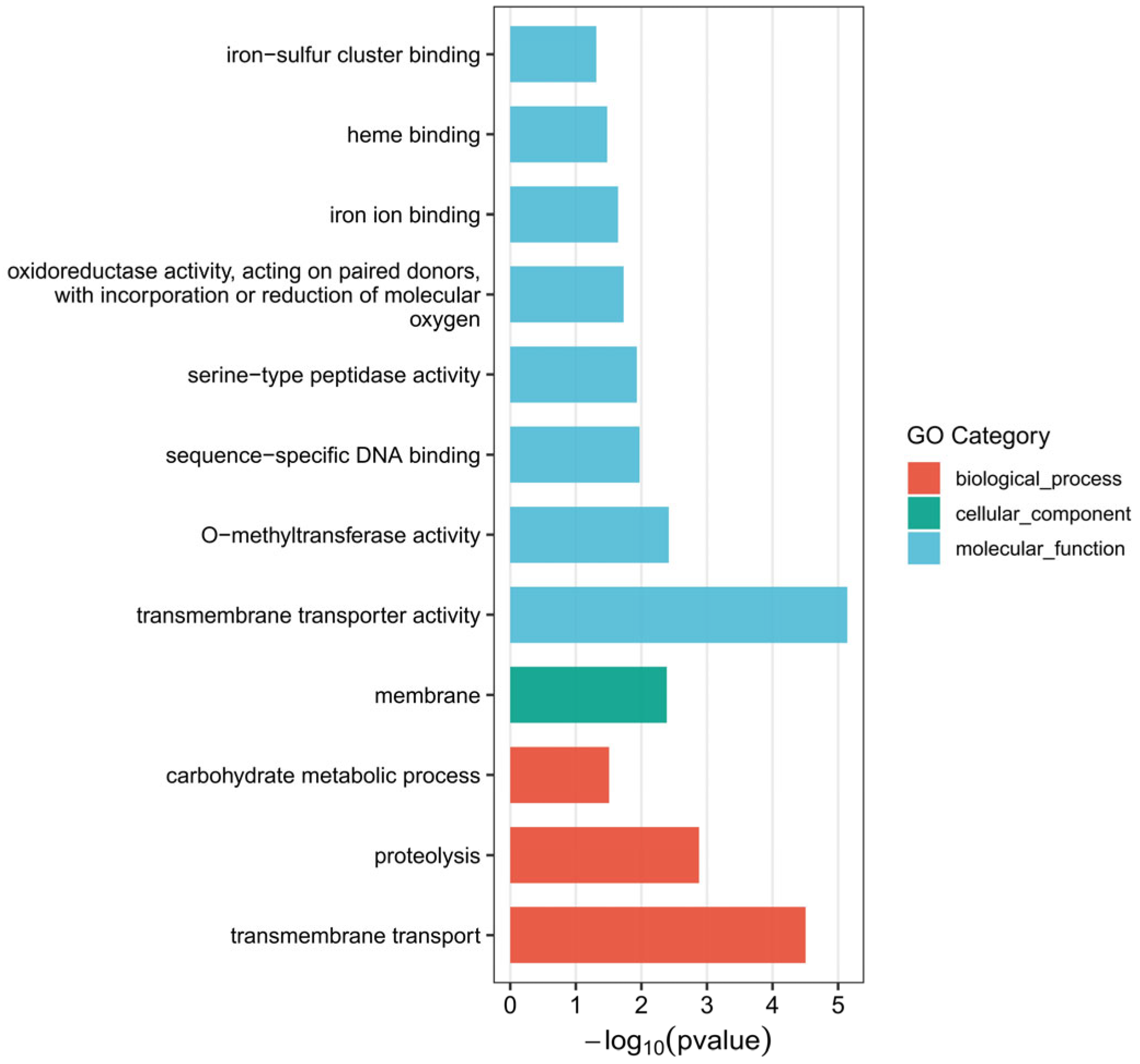 Figure 3A). In the MF category, DEGs were significantly enriched in transmembrane transporter activity, heme binding, and serine-type carboxypeptidase activity (