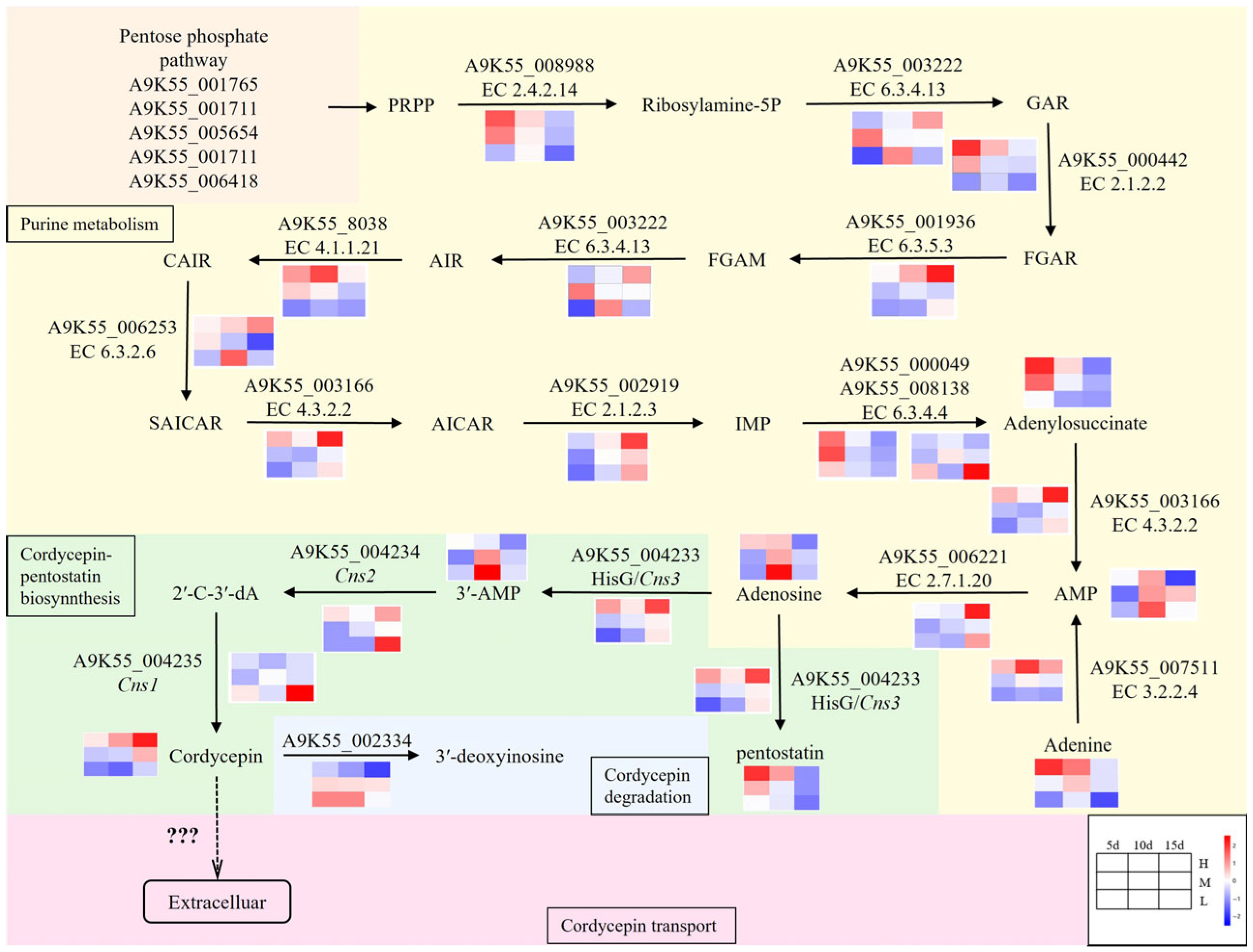 13]. By comparing transcriptomic differences between wild-type, high-yield, and low-yield cordycepin strains, the existence of complementary pathways for cordycepin biosynthesis in