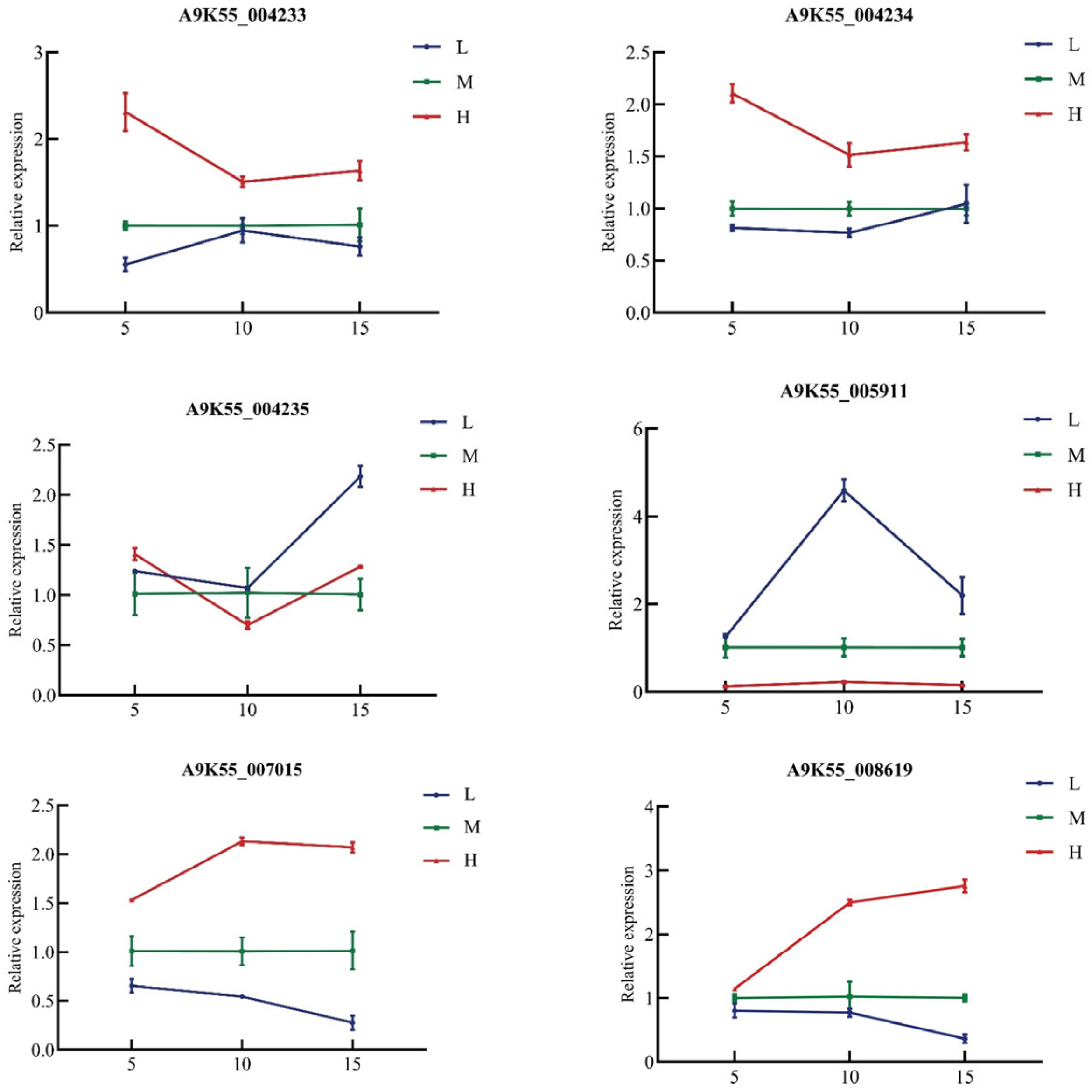 6 transcription factors, A9K55_007036, A9K55_007435, and A9K55_008577, that were significantly upregulated under high-temperature stress. These results suggest that Zn