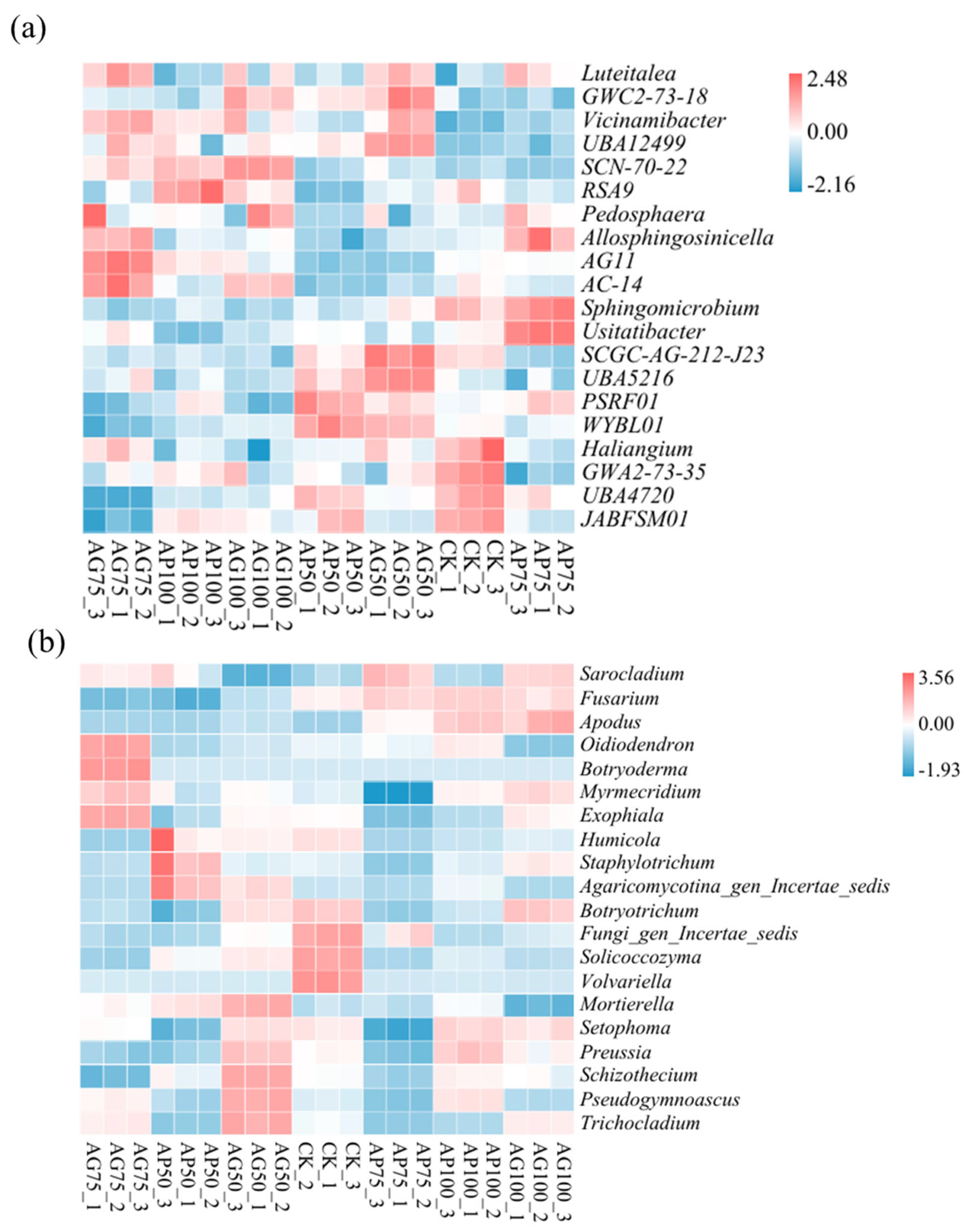3.6. Differences and Biomarker Analysis of Bacterial and Fungal Communities
