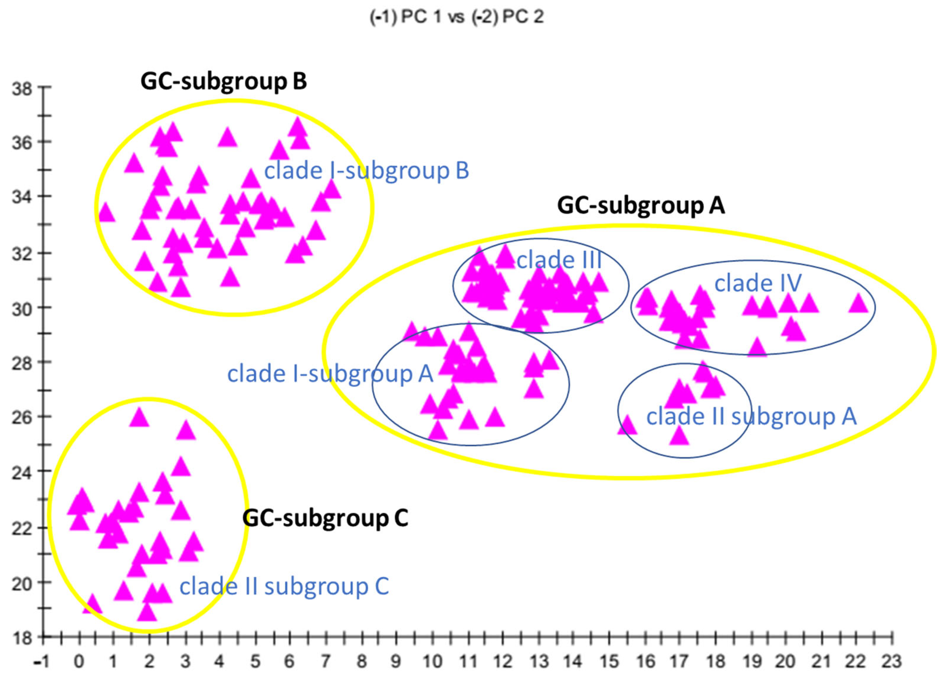 | GC subgroup C | 6.68 ± 0.55 | 18.96 ± 0.28 | 10.51 ± 0.56 | 3.81 ± 0.27 | 30.20 ± 0.62 | 3.20 ± 0.31 | 26.43 ± 0.51 |