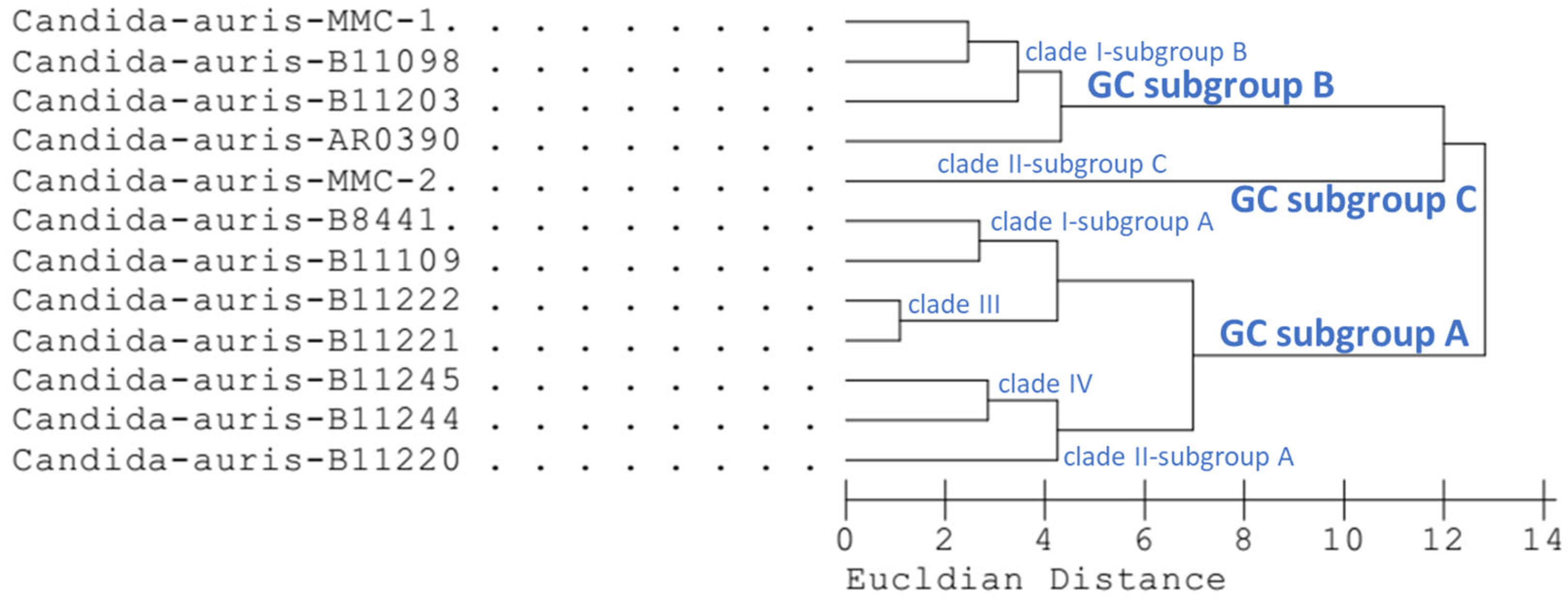 | C. auris GC subgroup B | - | - | - | 4.68 | 18.85 | - | 3.12 | 1.01 | 37.08 | 3.36 | 31.39 |