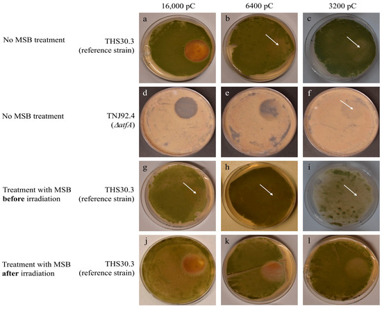 Proton irradiation tolerance of A. nidulans THS30.3 and TNJ92.4 strains. Cultures were irradiated with accumulated charges of 16,000, 6400, or 3200 pC (over an average of 22, 7.5, and 5 min, respectively). Some cultures were also treated with oxidative stress elicited by 0.1 mmol/L MSB applied before irradiation or after irradiation. After irradiation, the cultures were incubated at 24 °C for 2 days. Representative photos of three biological replicates taken after two days of post-irradiation incubation are shown: (a–c) cultures of the reference strain; (d–f) the ΔatfA mutant; (g–i) the MSB-pretreated cultures (note that cultures irradiated with 3200 pC were photographed at the end of day 1 to demonstrate the weak effect of irradiation, which was no longer visible after 2 days); and (j–l) the cultures treated with MSB after irradiation. The diameter of the Petri dish was 55 mm. The arrows indicate the irradiation zone (where the zone is not apparent).
