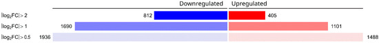 Gene set enrichment analyses (ShinyGo platform; bioinformatics.sdstate.edu/go/; accessed on 15 August 2025) were used to characterize the upregulated and downregulated gene sets (with thresholds of 0.5, 1, and 2). Default settings were applied, and only biological process GO terms were studied. Hits with a corrected p-value < 0.01 were regarded as significantly enriched.