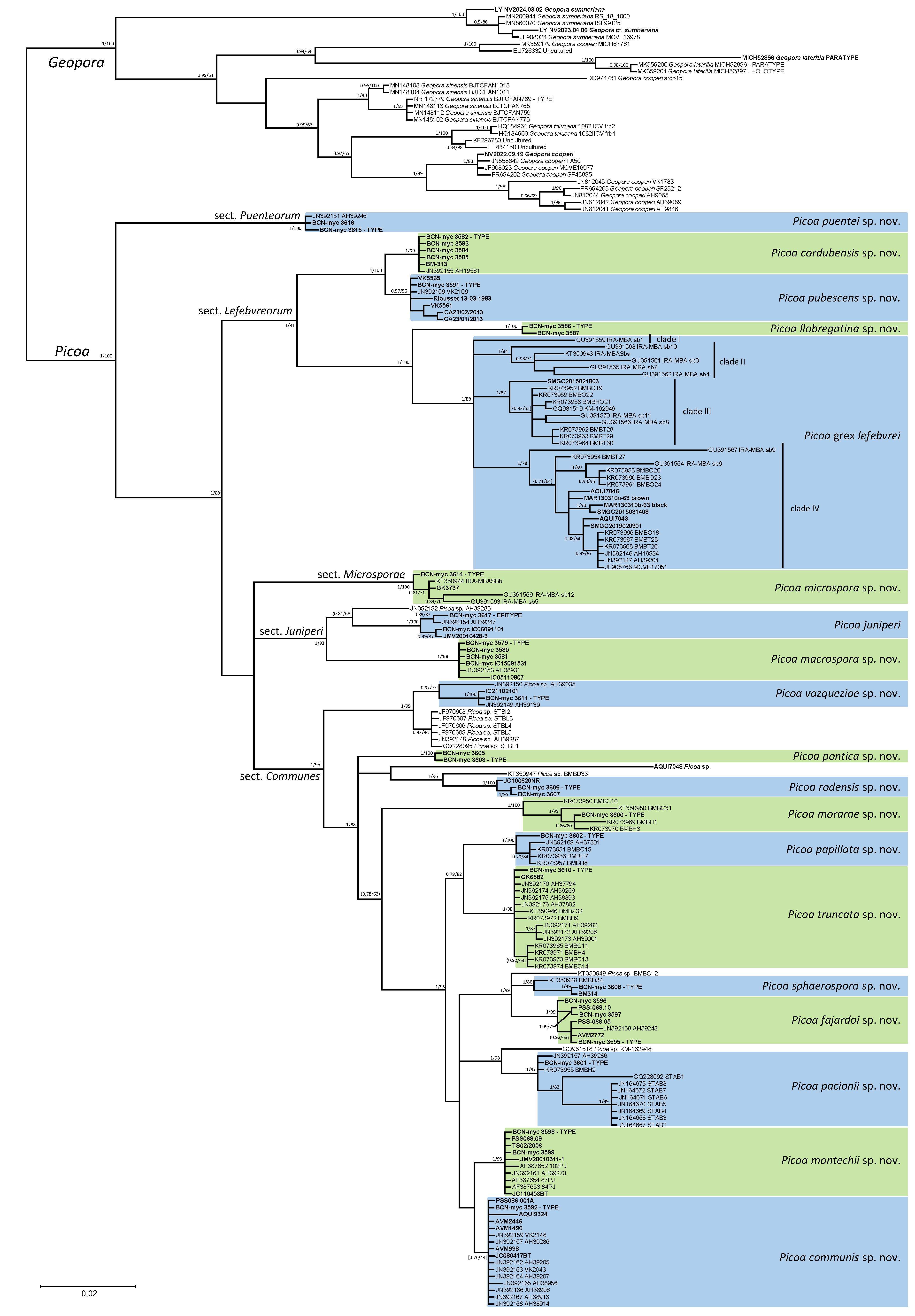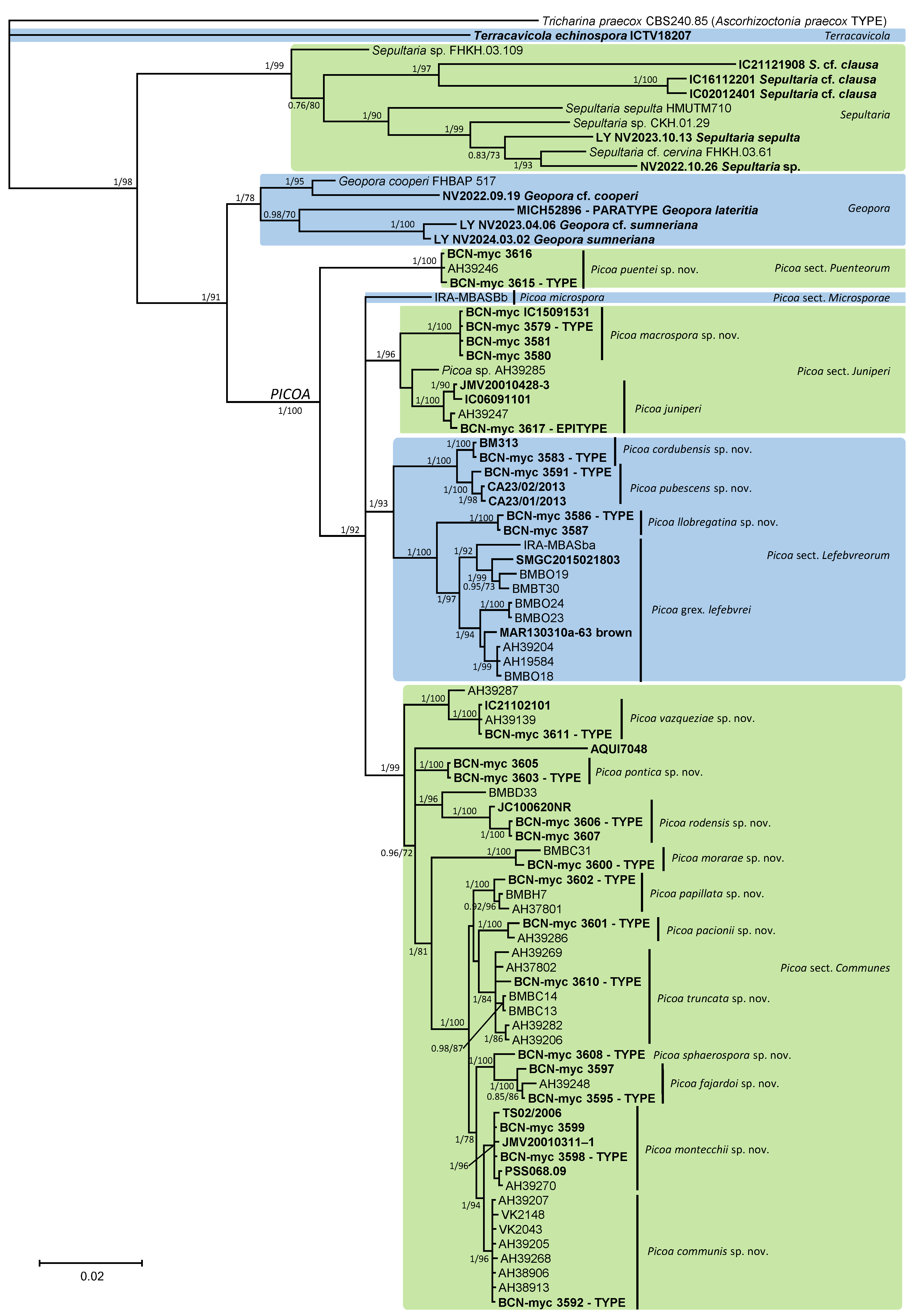 - The genus Picoa is characterized by having globose to subglobose or sometimes slightly lobed ascoma, compact gleba, with irregularly arranged fertile cells and, microscopically, by asci inamyloid, prototunicate, subglobose, with a long and simple thin-walled peduncle, containing 4–8 ascospores, spherical to ellipsoidal, hyaline, or slightly pigmented in golden tones, ornamented with granules, rugosities, or ridges when fully mature. The species grow under Cassia, Cistus, Cytisus, Helianthemum, Quercus, and/or Tuberaria in arid, sandy, neutral to calcareous soils.Type: Picoa juniperi Vittad.Notes: In the present work, the genus Picoa is formed by at least five main clades, here defined as sections. They roughly correspond to the major lineages already found by one of the authors (PA) in Zitouni-Haouar et al. [13], although lineages II and III in that work are merged into a single section (sect. Lefebvreorum) in the present study. The genus Picoa is sister to Geopora s. str. Both genera have globose or subglobose apothecia, an external surface (in most species) with warts and mycelial hairs, a distinctive hymenium, and sometimes a very folded gleba and, microscopically, inamyloid asci (staining blue in Melzer reagent), hyaline and cylindrical paraphyses, and mostly ellipsoidal to broadly ellipsoidal ascospores. The genus Sepultaria is also phylogenetically related to Picoa. It contains epigeous and hypogeous species and resembles Picoa because of its often warty external surface covered with mycelial hairs, distinct hymenium, inamyloid asci, hyaline paraphyses, and ellipsoid to broadly ellipsoid ascospores.