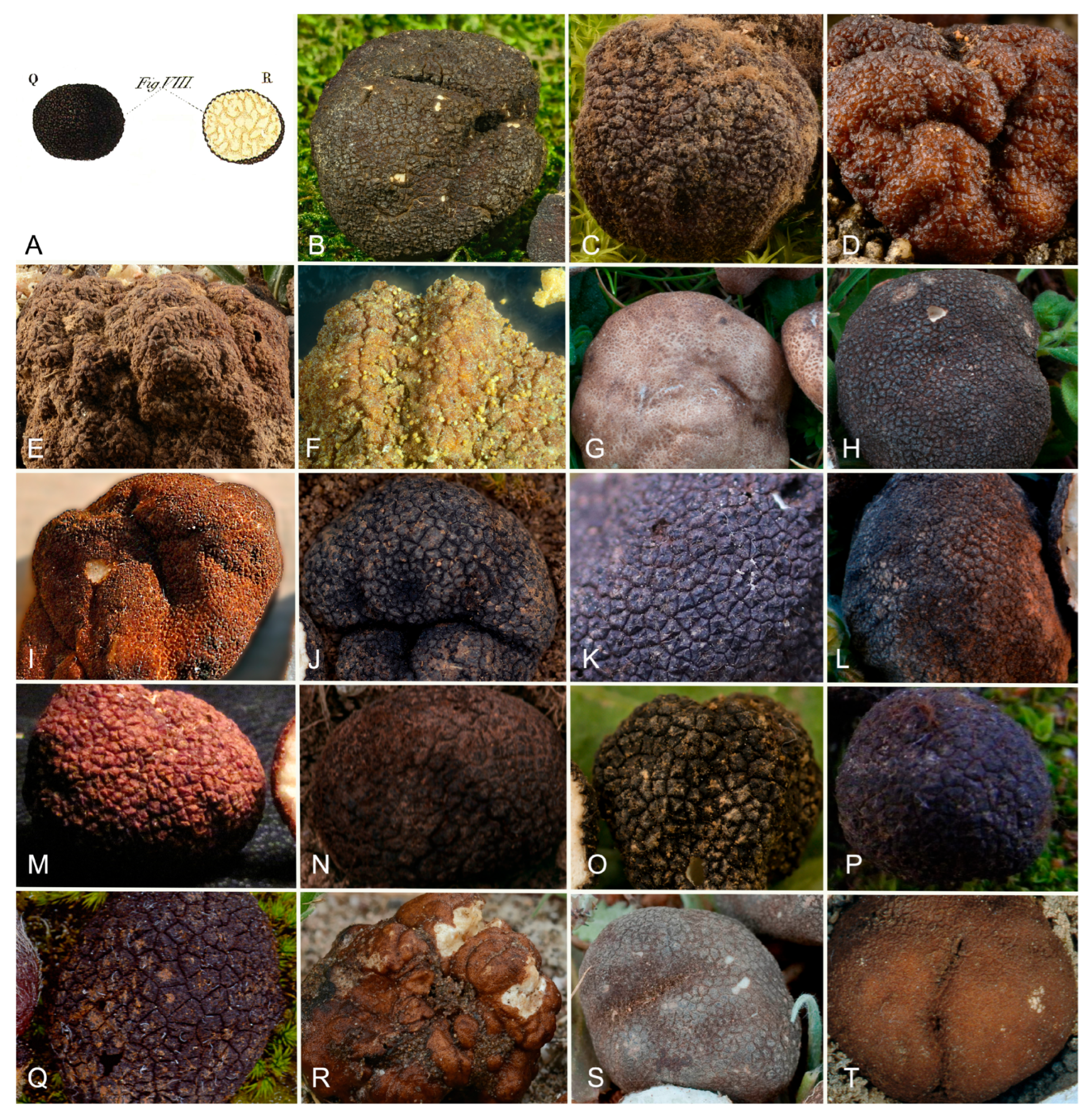 - Tulasne, L.R.; Tulasne, C. Fungi hypogaei. Histoire et Monographie des Champignons Hypogés; F. Klincksieck: Paris, France, 1862; 338p. [Google Scholar]