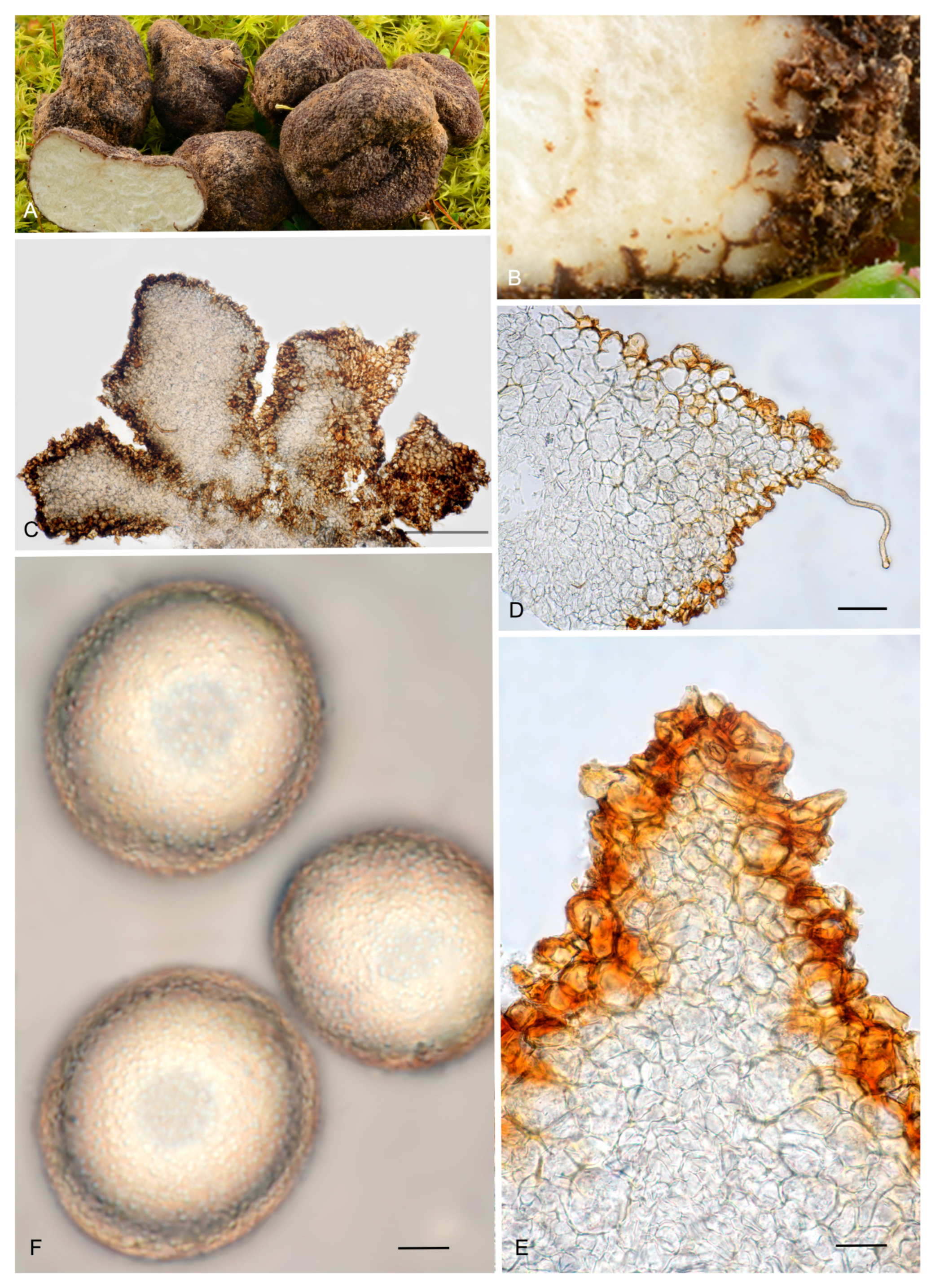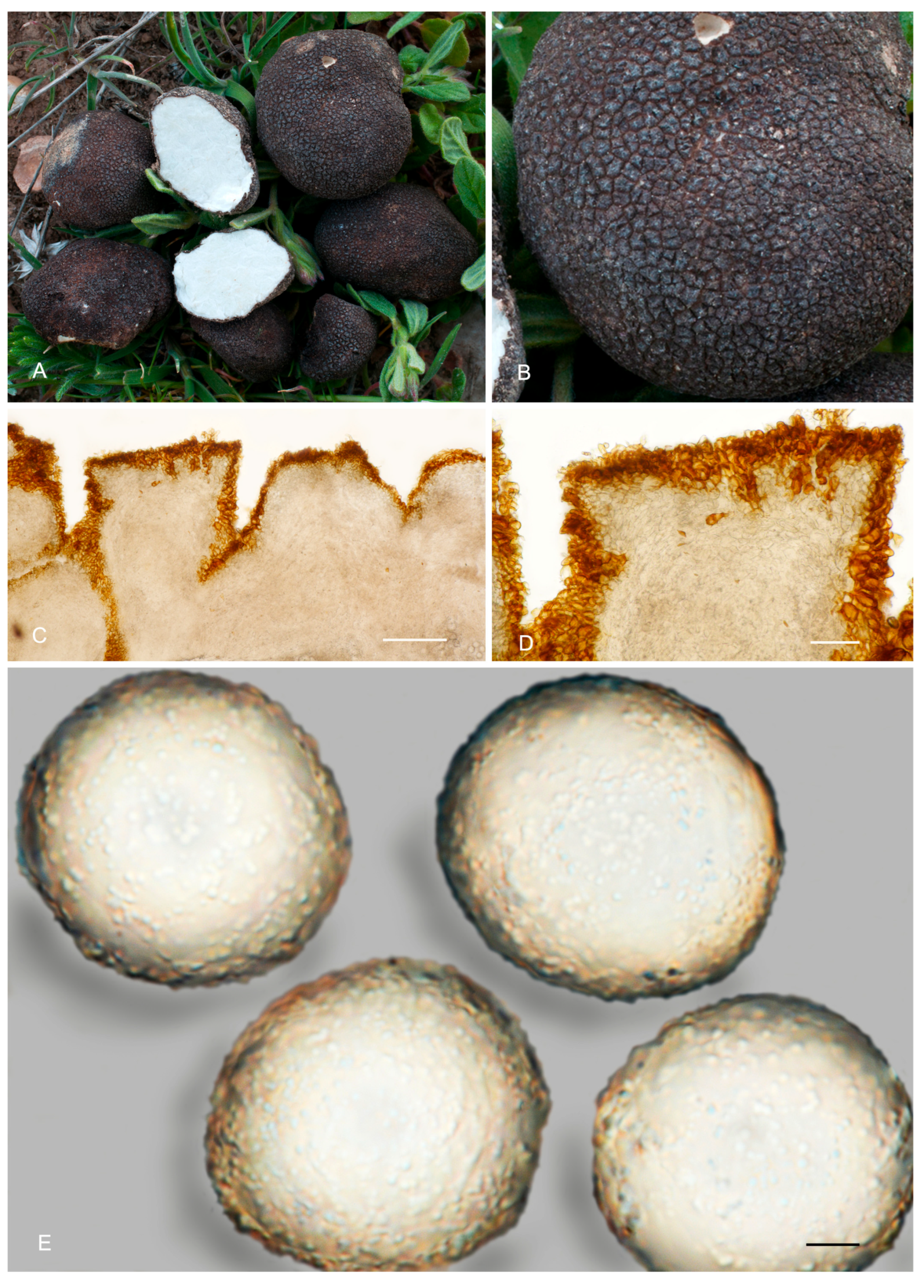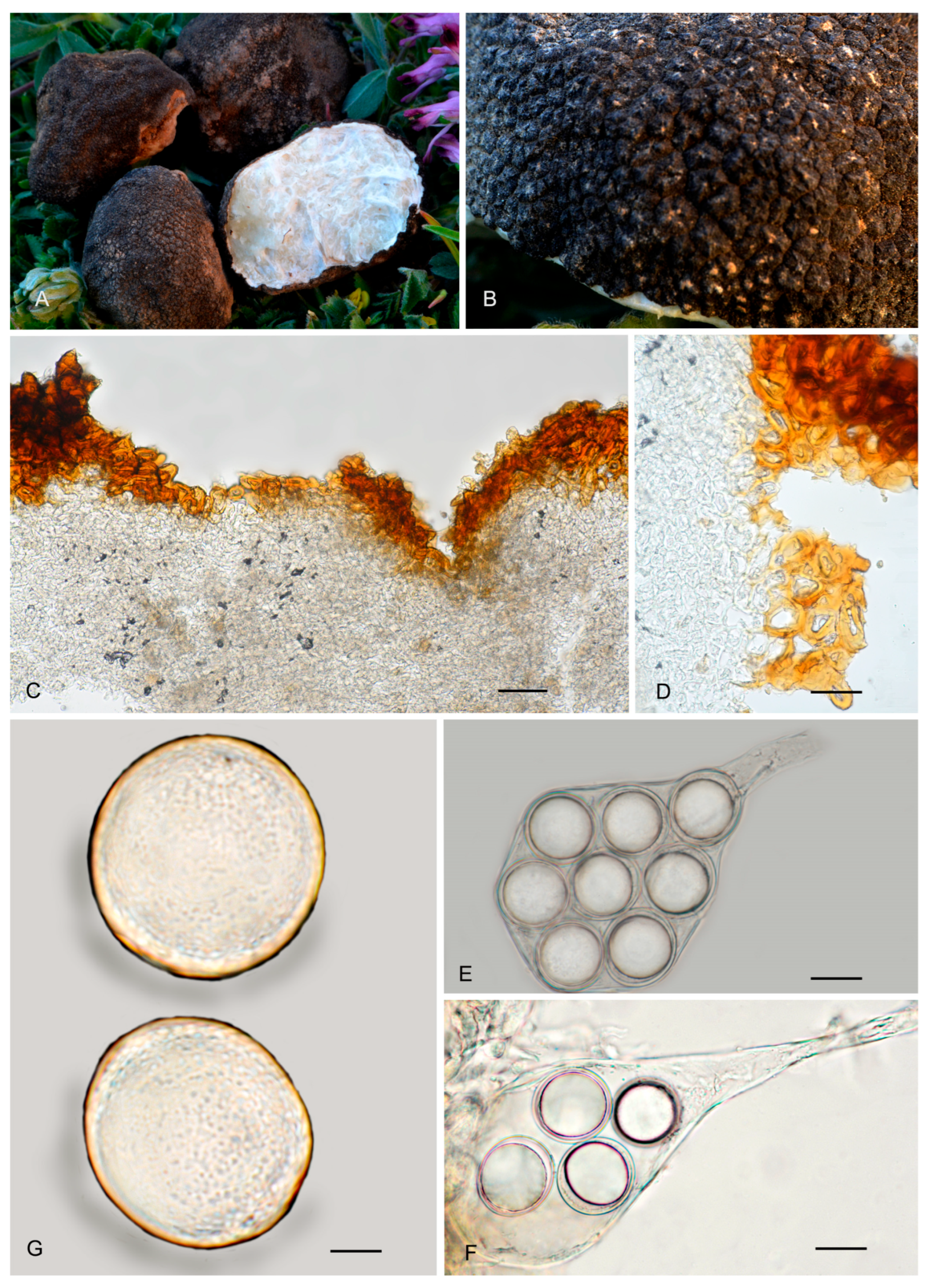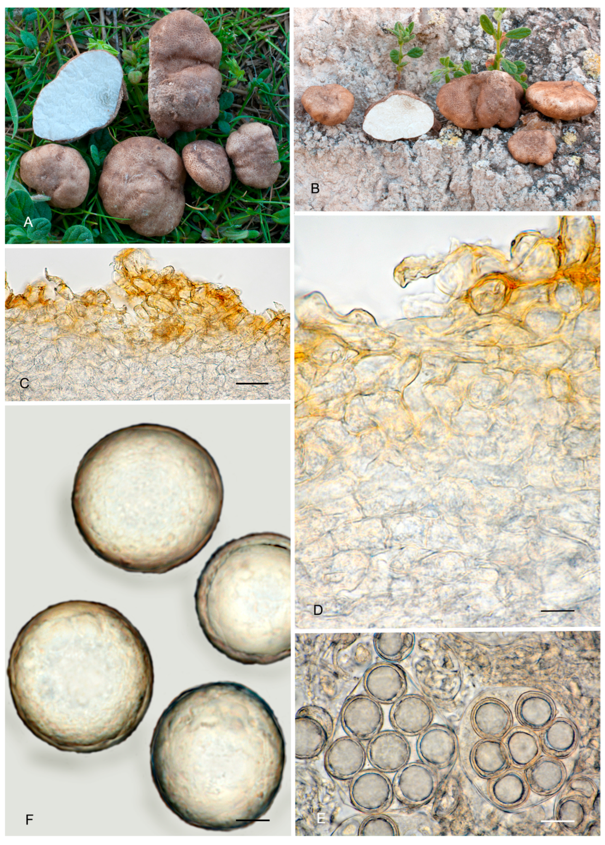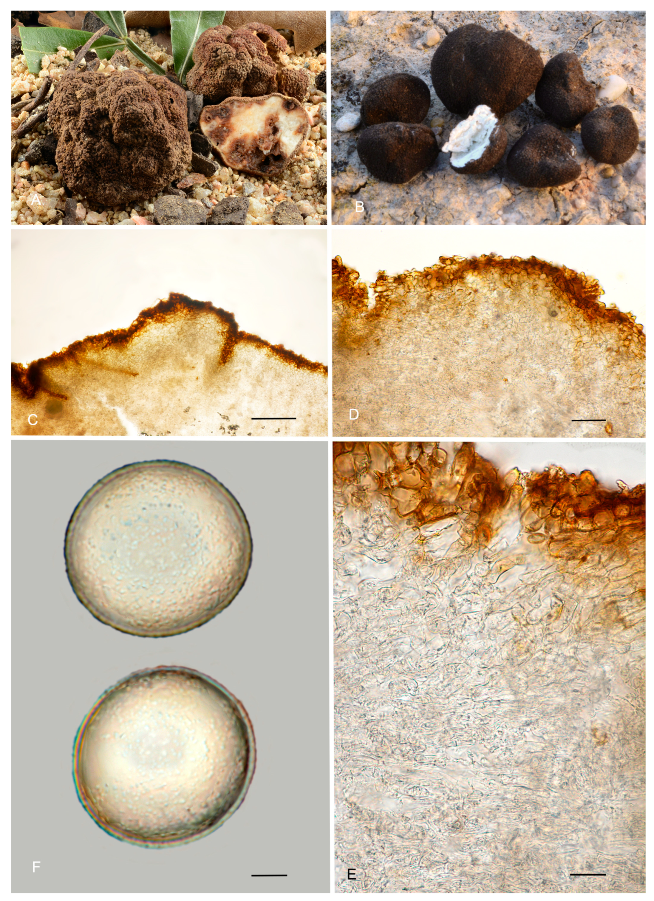 - Picoa truncata A. Paz, C. Lavoise, G. Konstantinidis, J.A. Martínez & J.M. Martínez, sp. nov. MB 859768. Figure 3, Figure 4 and Figure 5 and Figure 21.Etymology: From the Latin verb truncare, to truncate, in reference to the truncated apices of the warts on the surface of ascomata.Type: Spain, Castilla La Mancha, Cuenca, Belinchón, in calcareous soil, with annual Helianthemum sp. and Pinus halepensis, 4 April 2017, J. A. Martínez & J. M. Martinez (BCN-myc 3610 holotype, IC4041703 isotype).Ascomata form globose stereothecia, up to 38 mm diam., covered with black warts with a reddish-brown base, as well as mycelial hairs when young. Peridium (surface), with prominent compound pyramidal warts generally showing 2–4 edges and a truncated apex, measuring 257–412.5 µm (high) × 313.5–520.5 µm (base). Medullary excipulum (peridium section) arranged in three layers: (1) outer layer about 48.5–65 µm thick, formed by 3–4 (–5) rows of cells at the apices and 2–3 at the bases of the warts, textura angularis, pseudoparenchymatous, made of small subglobose sclerenchymatous cells, 12–28.5 × 11.5–24.5 µm, Q = 1.08, with walls up to 6.8 µm thick, dark brown pigmented; these cells are interspersed with the bases of many conical mycelial hairs, measuring 19.5 × 14.5 µm on average, hairs septate, measuring 120 × 8 µm on average; (2) intermediate layer 102.5–146 µm thick, textura angularis, made of very small, hyaline, sclerenchymatous globose to polyhedric cells, 7.5–15.5 × 8–15.5 µm, Q = 0.99; (3) internal layer (transition toward the gleba) 327.5–498 µm thick, textura intricate, composed by a plectenchymatous structure made of increasingly elongated and intrincate cells, measuring 11–22 × 5–8 µm, Q = 0.39. Gleba containing sterile zones with an intricate texture, made of elongated and bifurcate hyphae, with septa measuring 11 × 4.5 µm on average, as well as disordered fertile areas with asci. Asci 162.5–163–166.5 × 66.5–68–70.5 µm on average, quickly evanescent, inamyloid, prototunicate, subglobose, peduncle 50–65 µm long (included in the ascus measurements), with a thin and simple wall, containing 4–8 ascospores. Ascospores broadly ellipsoidal, 25–26.5–27.5 × 23–23.5–24 µm, Q = 1.08–1.12, ornamented with large isolated granules.Ecology and Distribution: Found so far in Algeria [13,33], Greece, Italy, and Spain, in nutrient-poor calcareous soils, maybe associated with Pinus halepensis and/or Helianthemum sp., in spring (March-April).Additional material studied: Greece, West Macedonia, Kozani, Petrana, near Helianthemum sp., 30 March 2013, I. Karagkiozis GK6582*.Notes: Picoa truncata is characterized by (1) mycelial hairs absent at maturity; (2) surface with compound pyramidal warts, showing 2–4 edges, truncated and with a reddish base; (3) outer layer of the peridium thick (2–5 rows of cells), pseudoparenchymatous, made of subglobose, sclerenchymatous cells, with walls up to 6.8 µm thick; (4) intermediate layer of the peridium pseudoparenchymatous, made of very small globose to polyhedric cells, 11.5 × 12 µm on average; (5) ascospores broadly ellipsoidal, ornamented with large isolated granules; (6) preference for calcareous soils; (7) probably associated with Helianthemum sp. or maybe Pinus halepensis. The most closely related species are P. communis, P. fajardoi, P. montecchii, P. morarae, P. pacionii, P. papillata, P. pontica, P. rodensis, P. sphaerospora, and P. vazqueziae. The first nine species are compared with P. truncata above. Picoa vazqueziae produces ascomata covered by very prominent warts with acute, not truncated, apices; outer layer of the peridium made of parallelepipedic to elongated cells; and ascospores ornamented with tiny, isolated granules.