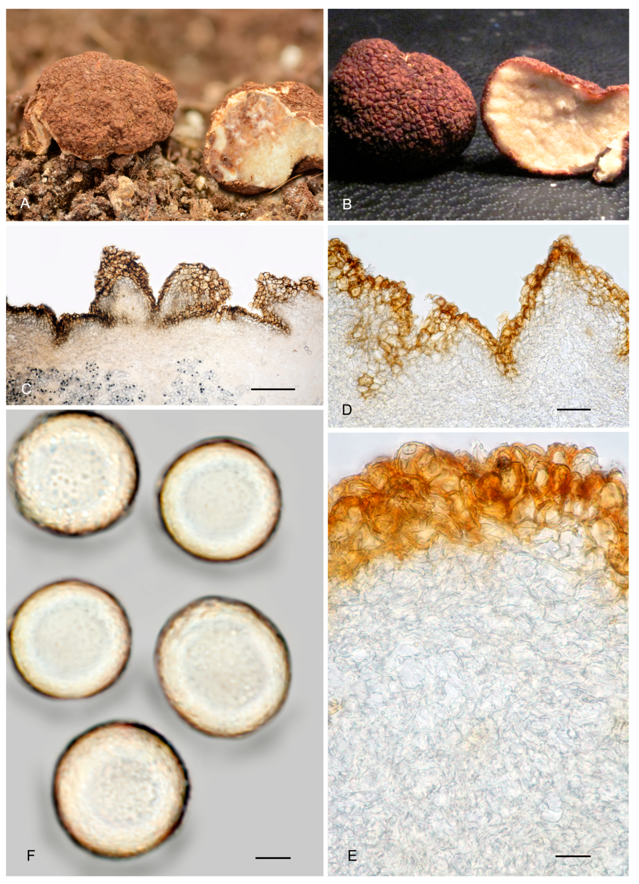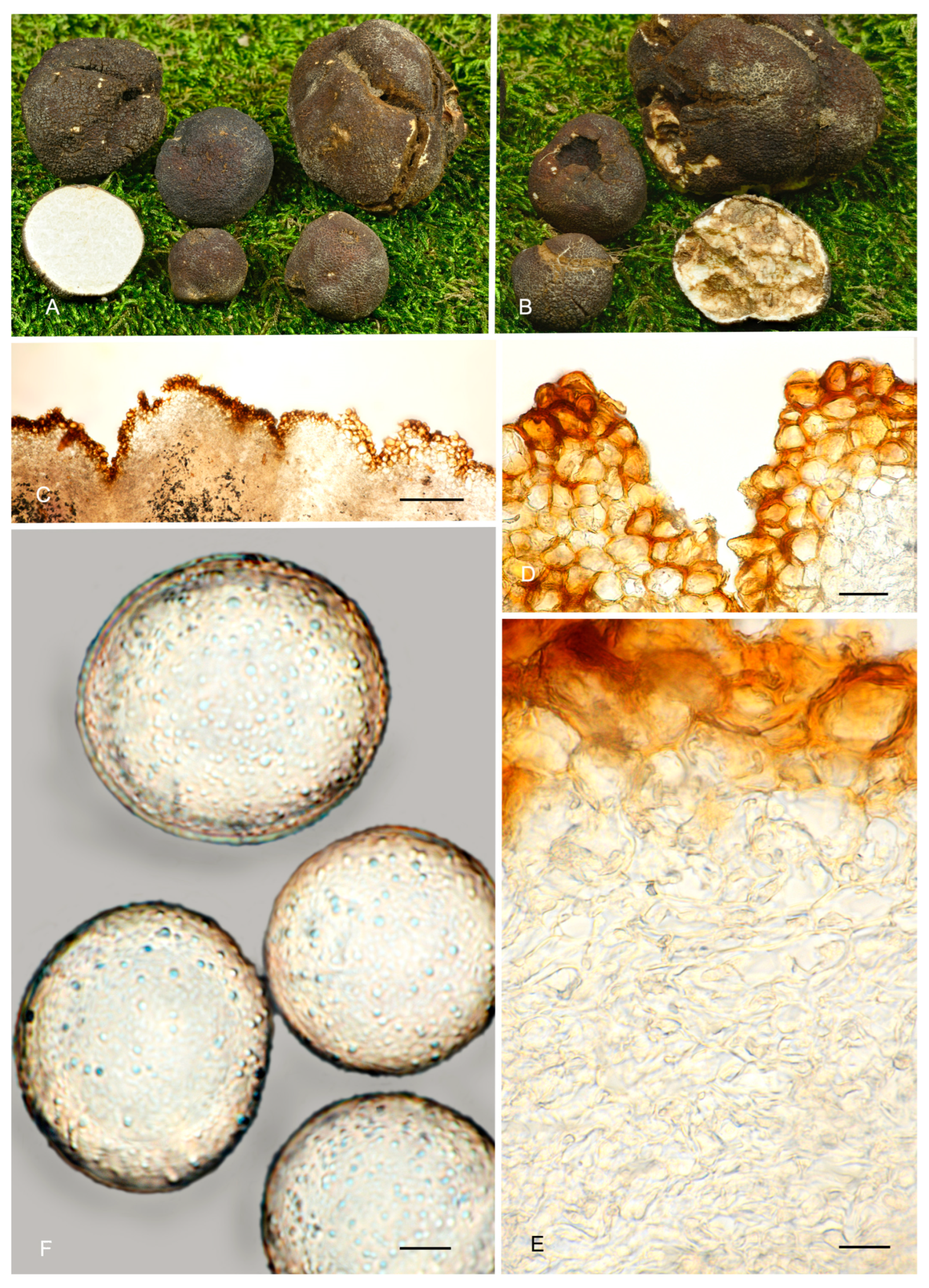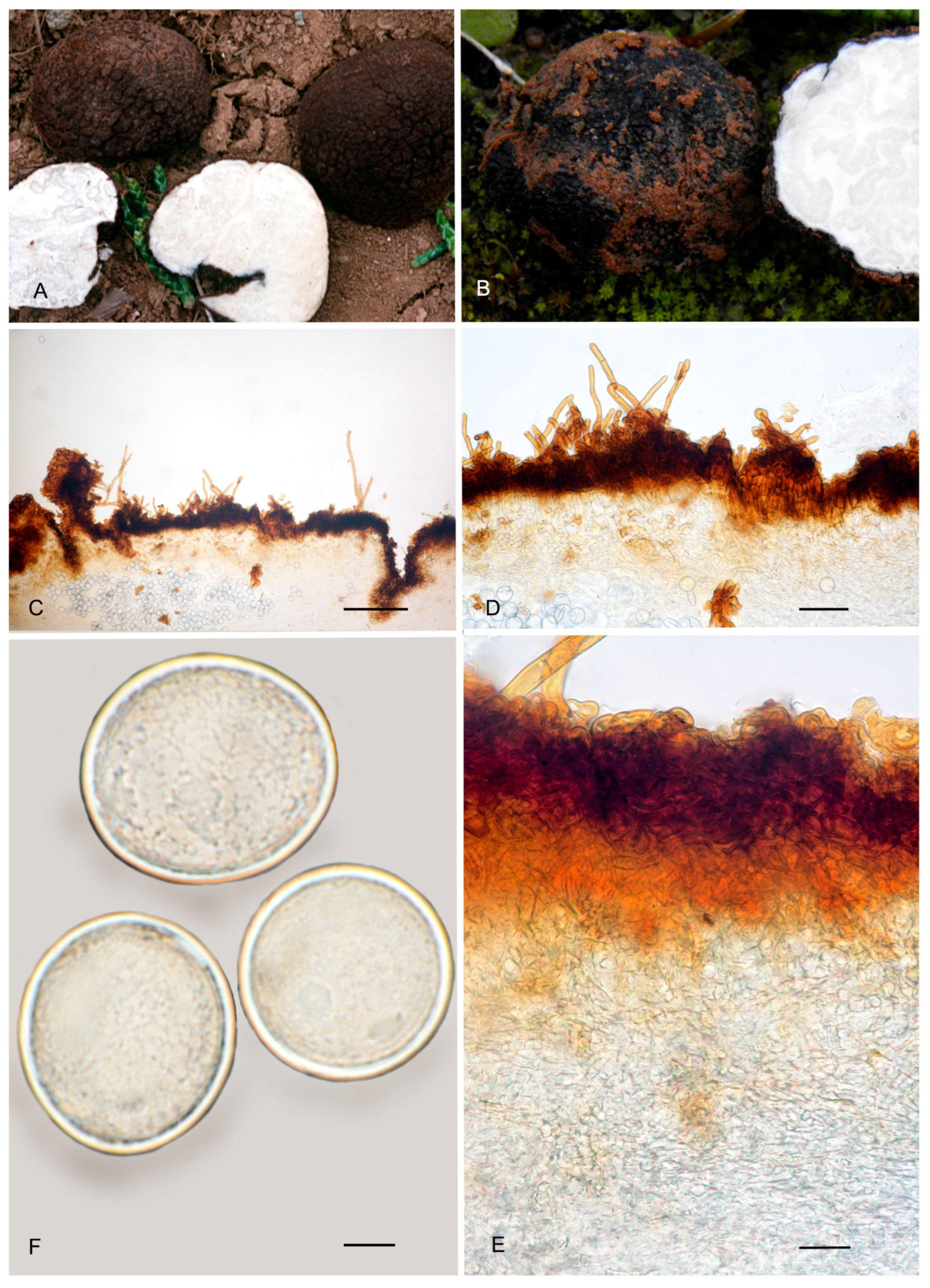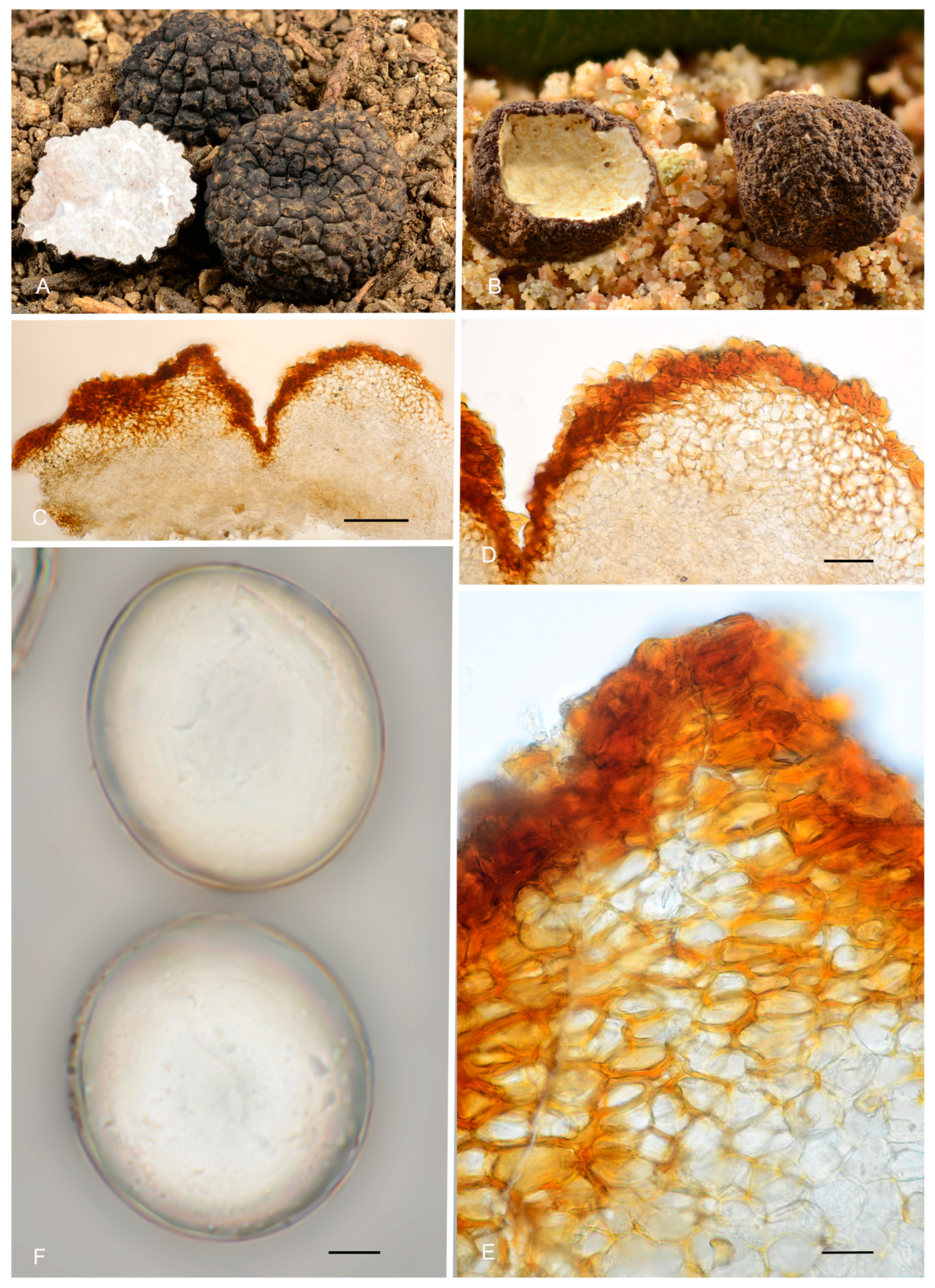 - Picoa truncata A. Paz, C. Lavoise, G. Konstantinidis, J.A. Martínez & J.M. Martínez, sp. nov. MB 859768. Figure 3, Figure 4 and Figure 5 and Figure 21.Etymology: From the Latin verb truncare, to truncate, in reference to the truncated apices of the warts on the surface of ascomata.Type: Spain, Castilla La Mancha, Cuenca, Belinchón, in calcareous soil, with annual Helianthemum sp. and Pinus halepensis, 4 April 2017, J. A. Martínez & J. M. Martinez (BCN-myc 3610 holotype, IC4041703 isotype).Ascomata form globose stereothecia, up to 38 mm diam., covered with black warts with a reddish-brown base, as well as mycelial hairs when young. Peridium (surface), with prominent compound pyramidal warts generally showing 2–4 edges and a truncated apex, measuring 257–412.5 µm (high) × 313.5–520.5 µm (base). Medullary excipulum (peridium section) arranged in three layers: (1) outer layer about 48.5–65 µm thick, formed by 3–4 (–5) rows of cells at the apices and 2–3 at the bases of the warts, textura angularis, pseudoparenchymatous, made of small subglobose sclerenchymatous cells, 12–28.5 × 11.5–24.5 µm, Q = 1.08, with walls up to 6.8 µm thick, dark brown pigmented; these cells are interspersed with the bases of many conical mycelial hairs, measuring 19.5 × 14.5 µm on average, hairs septate, measuring 120 × 8 µm on average; (2) intermediate layer 102.5–146 µm thick, textura angularis, made of very small, hyaline, sclerenchymatous globose to polyhedric cells, 7.5–15.5 × 8–15.5 µm, Q = 0.99; (3) internal layer (transition toward the gleba) 327.5–498 µm thick, textura intricate, composed by a plectenchymatous structure made of increasingly elongated and intrincate cells, measuring 11–22 × 5–8 µm, Q = 0.39. Gleba containing sterile zones with an intricate texture, made of elongated and bifurcate hyphae, with septa measuring 11 × 4.5 µm on average, as well as disordered fertile areas with asci. Asci 162.5–163–166.5 × 66.5–68–70.5 µm on average, quickly evanescent, inamyloid, prototunicate, subglobose, peduncle 50–65 µm long (included in the ascus measurements), with a thin and simple wall, containing 4–8 ascospores. Ascospores broadly ellipsoidal, 25–26.5–27.5 × 23–23.5–24 µm, Q = 1.08–1.12, ornamented with large isolated granules.Ecology and Distribution: Found so far in Algeria [13,33], Greece, Italy, and Spain, in nutrient-poor calcareous soils, maybe associated with Pinus halepensis and/or Helianthemum sp., in spring (March-April).Additional material studied: Greece, West Macedonia, Kozani, Petrana, near Helianthemum sp., 30 March 2013, I. Karagkiozis GK6582*.Notes: Picoa truncata is characterized by (1) mycelial hairs absent at maturity; (2) surface with compound pyramidal warts, showing 2–4 edges, truncated and with a reddish base; (3) outer layer of the peridium thick (2–5 rows of cells), pseudoparenchymatous, made of subglobose, sclerenchymatous cells, with walls up to 6.8 µm thick; (4) intermediate layer of the peridium pseudoparenchymatous, made of very small globose to polyhedric cells, 11.5 × 12 µm on average; (5) ascospores broadly ellipsoidal, ornamented with large isolated granules; (6) preference for calcareous soils; (7) probably associated with Helianthemum sp. or maybe Pinus halepensis. The most closely related species are P. communis, P. fajardoi, P. montecchii, P. morarae, P. pacionii, P. papillata, P. pontica, P. rodensis, P. sphaerospora, and P. vazqueziae. The first nine species are compared with P. truncata above. Picoa vazqueziae produces ascomata covered by very prominent warts with acute, not truncated, apices; outer layer of the peridium made of parallelepipedic to elongated cells; and ascospores ornamented with tiny, isolated granules.