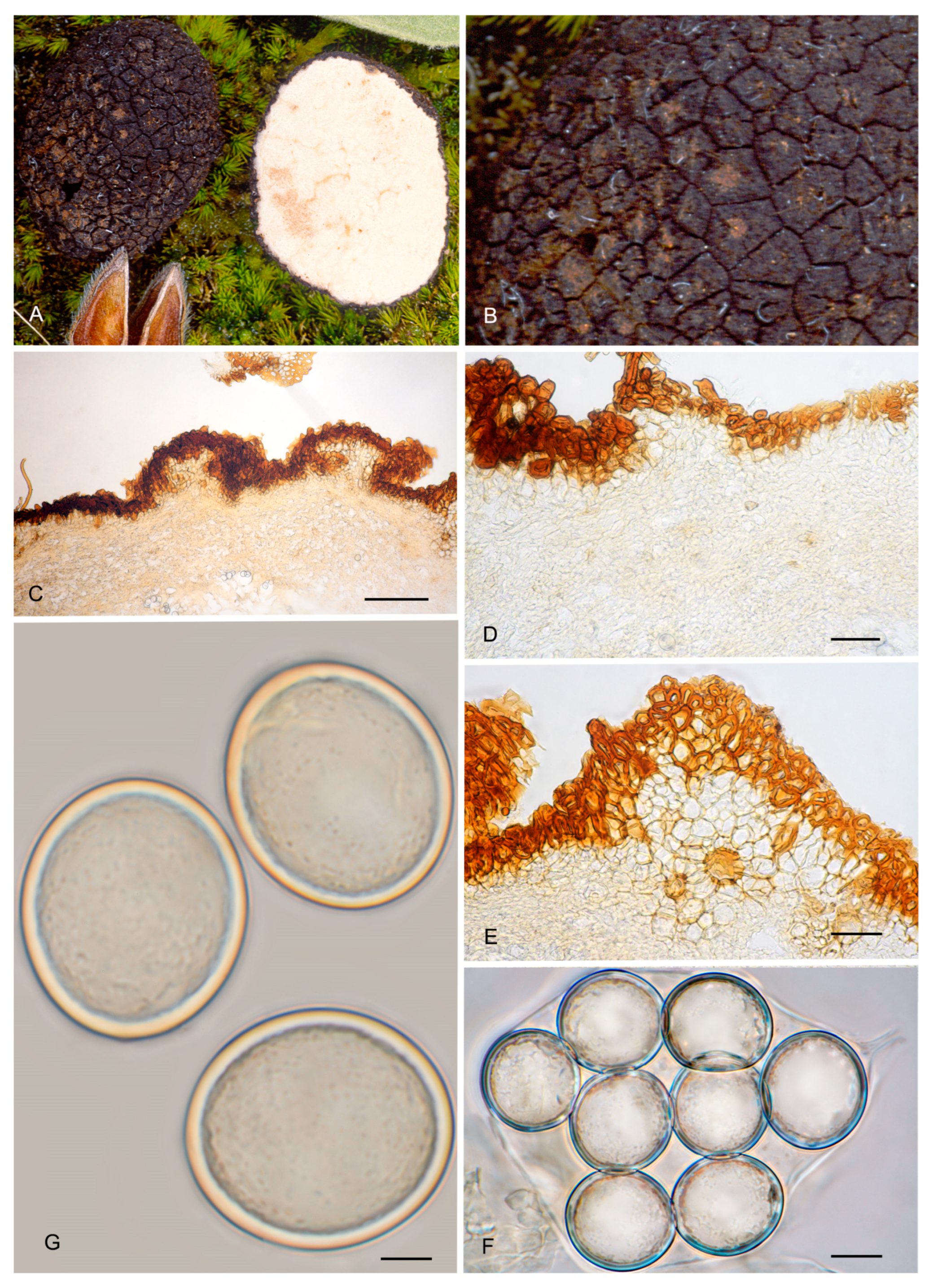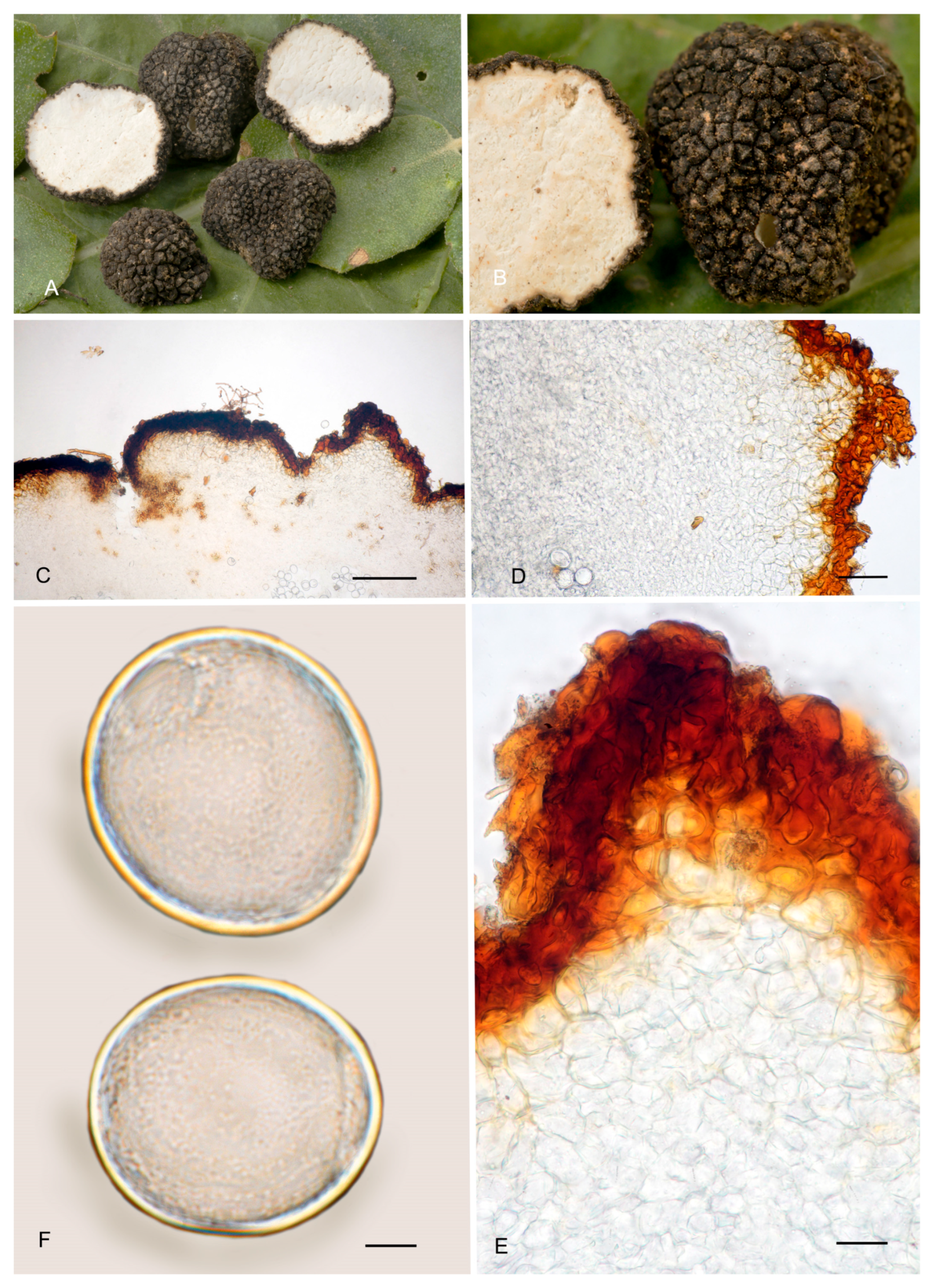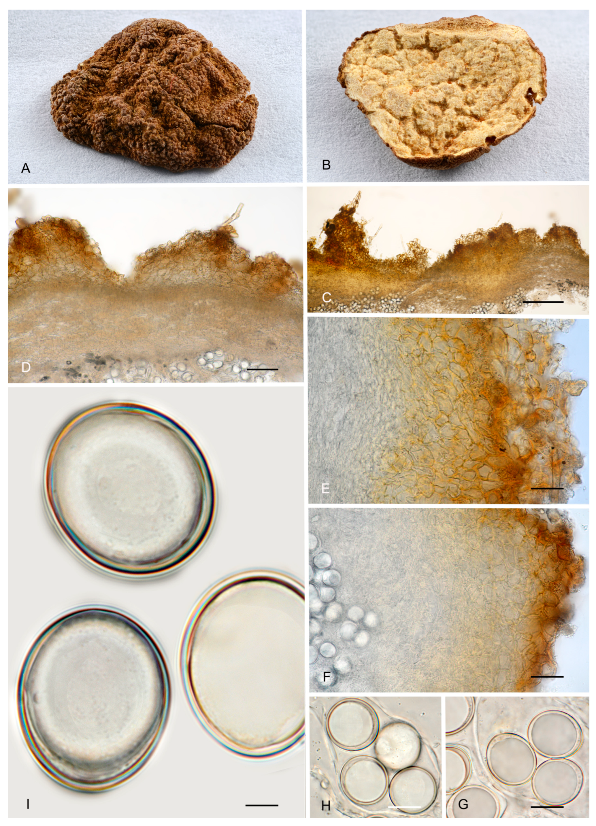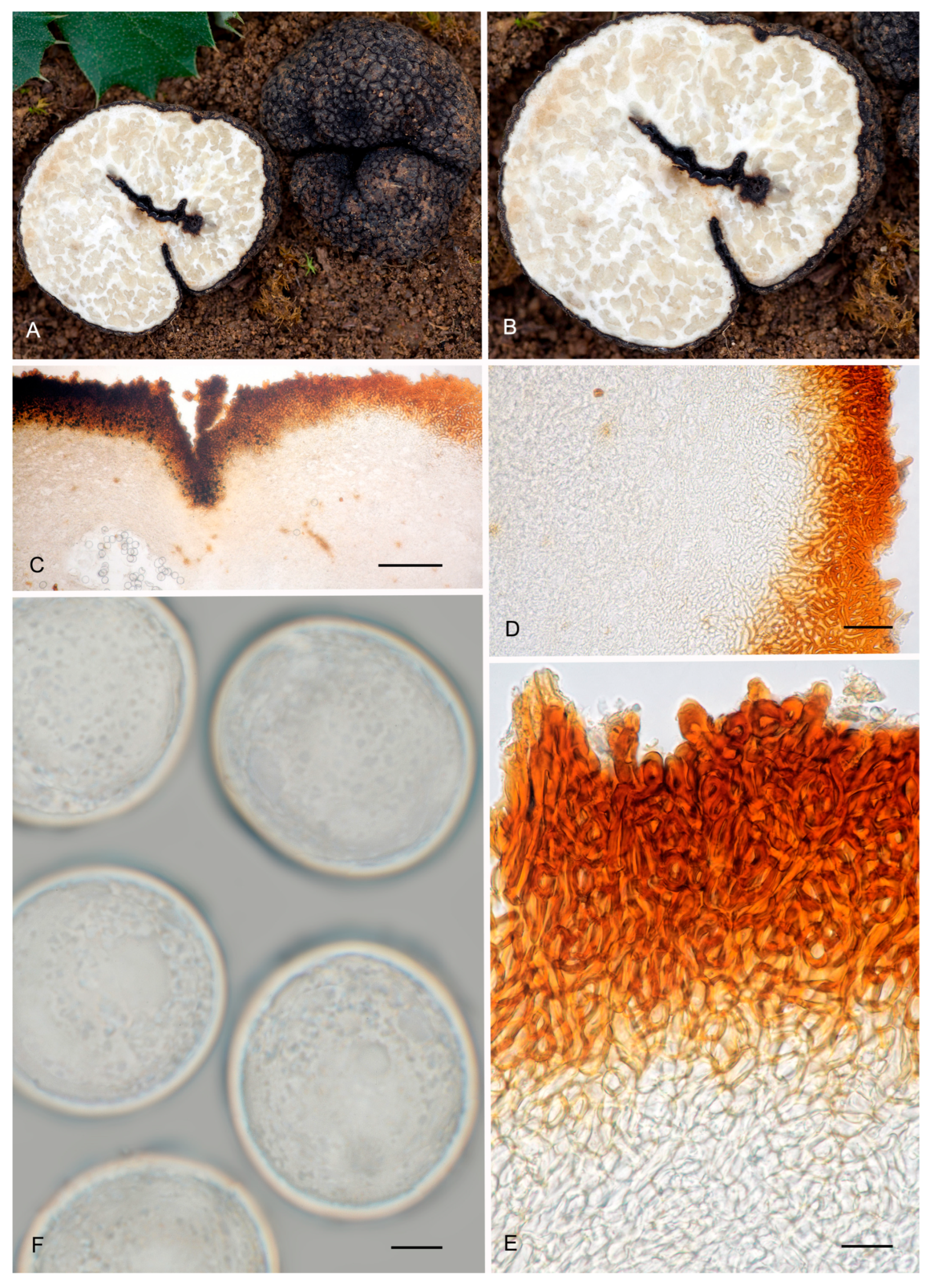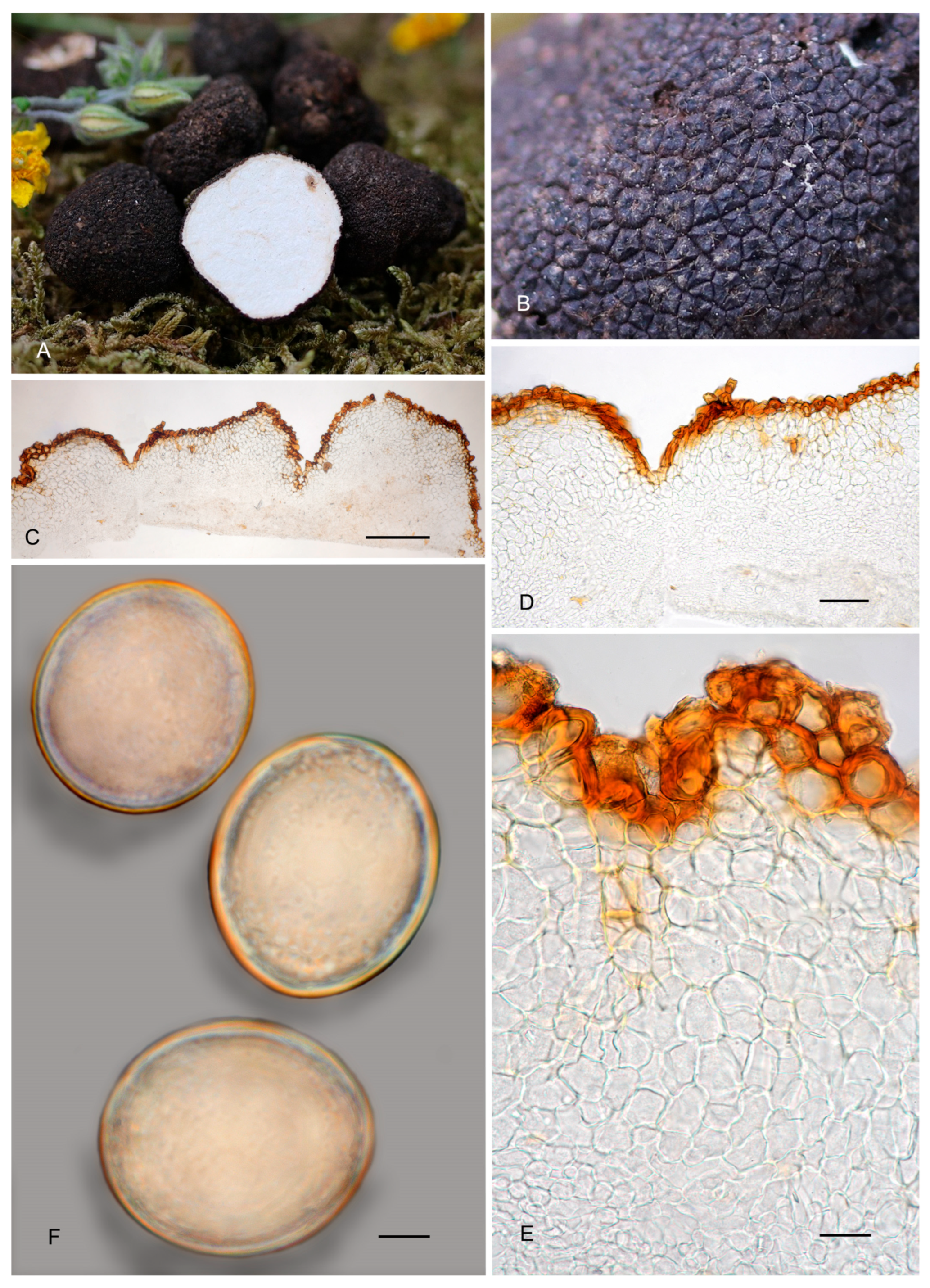- Picoa truncata A. Paz, C. Lavoise, G. Konstantinidis, J.A. Martínez & J.M. Martínez, sp. nov. MB 859768. Figure 3, Figure 4 and Figure 5 and Figure 21.Etymology: From the Latin verb truncare, to truncate, in reference to the truncated apices of the warts on the surface of ascomata.Type: Spain, Castilla La Mancha, Cuenca, Belinchón, in calcareous soil, with annual Helianthemum sp. and Pinus halepensis, 4 April 2017, J. A. Martínez & J. M. Martinez (BCN-myc 3610 holotype, IC4041703 isotype).Ascomata form globose stereothecia, up to 38 mm diam., covered with black warts with a reddish-brown base, as well as mycelial hairs when young. Peridium (surface), with prominent compound pyramidal warts generally showing 2–4 edges and a truncated apex, measuring 257–412.5 µm (high) × 313.5–520.5 µm (base). Medullary excipulum (peridium section) arranged in three layers: (1) outer layer about 48.5–65 µm thick, formed by 3–4 (–5) rows of cells at the apices and 2–3 at the bases of the warts, textura angularis, pseudoparenchymatous, made of small subglobose sclerenchymatous cells, 12–28.5 × 11.5–24.5 µm, Q = 1.08, with walls up to 6.8 µm thick, dark brown pigmented; these cells are interspersed with the bases of many conical mycelial hairs, measuring 19.5 × 14.5 µm on average, hairs septate, measuring 120 × 8 µm on average; (2) intermediate layer 102.5–146 µm thick, textura angularis, made of very small, hyaline, sclerenchymatous globose to polyhedric cells, 7.5–15.5 × 8–15.5 µm, Q = 0.99; (3) internal layer (transition toward the gleba) 327.5–498 µm thick, textura intricate, composed by a plectenchymatous structure made of increasingly elongated and intrincate cells, measuring 11–22 × 5–8 µm, Q = 0.39. Gleba containing sterile zones with an intricate texture, made of elongated and bifurcate hyphae, with septa measuring 11 × 4.5 µm on average, as well as disordered fertile areas with asci. Asci 162.5–163–166.5 × 66.5–68–70.5 µm on average, quickly evanescent, inamyloid, prototunicate, subglobose, peduncle 50–65 µm long (included in the ascus measurements), with a thin and simple wall, containing 4–8 ascospores. Ascospores broadly ellipsoidal, 25–26.5–27.5 × 23–23.5–24 µm, Q = 1.08–1.12, ornamented with large isolated granules.Ecology and Distribution: Found so far in Algeria [13,33], Greece, Italy, and Spain, in nutrient-poor calcareous soils, maybe associated with Pinus halepensis and/or Helianthemum sp., in spring (March-April).Additional material studied: Greece, West Macedonia, Kozani, Petrana, near Helianthemum sp., 30 March 2013, I. Karagkiozis GK6582*.Notes: Picoa truncata is characterized by (1) mycelial hairs absent at maturity; (2) surface with compound pyramidal warts, showing 2–4 edges, truncated and with a reddish base; (3) outer layer of the peridium thick (2–5 rows of cells), pseudoparenchymatous, made of subglobose, sclerenchymatous cells, with walls up to 6.8 µm thick; (4) intermediate layer of the peridium pseudoparenchymatous, made of very small globose to polyhedric cells, 11.5 × 12 µm on average; (5) ascospores broadly ellipsoidal, ornamented with large isolated granules; (6) preference for calcareous soils; (7) probably associated with Helianthemum sp. or maybe Pinus halepensis. The most closely related species are P. communis, P. fajardoi, P. montecchii, P. morarae, P. pacionii, P. papillata, P. pontica, P. rodensis, P. sphaerospora, and P. vazqueziae. The first nine species are compared with P. truncata above. Picoa vazqueziae produces ascomata covered by very prominent warts with acute, not truncated, apices; outer layer of the peridium made of parallelepipedic to elongated cells; and ascospores ornamented with tiny, isolated granules.