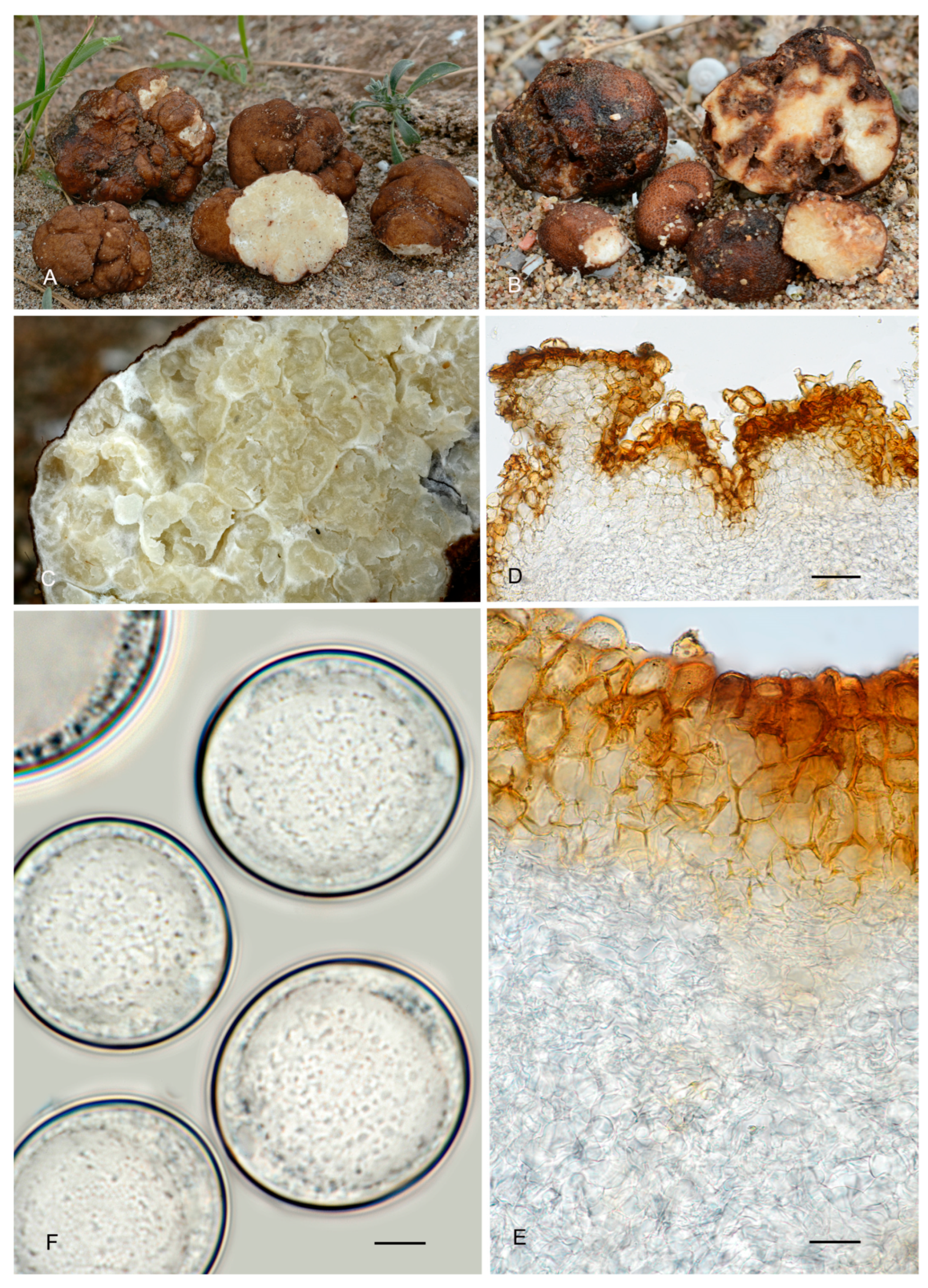 - Picoa communis A. Paz, C. Lavoise, L.-A. Parra, B. Vázquez & L. Barrio, sp. nov. MB 859758. Figure 3, Figure 4 and Figure 5 and Figure 12.Etymology: The Latin epithet “communis” means common and refers to its abundance among collections found in Spain.Type: Spain, Castilla y León, Palencia, meadow with Tuberaria guttata and Helianthemum sp., 25 April 2016, L.-A. Parra, C. Lavoise, C. Rojo & A. Paz (BCN-myc 3592 holotype, IC25041601 isotype).Ascomata form subglobose stereothecia, up to 45 mm diam., with surface sometimes cracked, reddish brown to dark brown with age, initially covered with abundant reddish brown mycelial hairs, disappearing with age or handling. Peridium (surface) forms simple warts, very irregular in shape and size, 185–350 (height) × 310–540 µm (base). Medullary excipulum (peridium section) arranged in three layers: (1) outer layer 32.5–116 µm thick, textura angularis, with a pseudoparenchymatous structure, made of globose to polyhedrical sclerenchymatous cells measuring 30 × 27.5 µm on average, Q = 1.12, walls up to 4.2 µm thick, intensely brown pigmented; peridium cells form 1–2 rows at the base of warts and 3–4 at the apices; young ascomata have hairs in the outer peridium layer, 230–350 × 8–11 µm, with rounded tips and inflated bases about 39–45 µm wide, septa measuring 35–55 µm long; (2) intermediate layer 42.5–74 µm thick, textura angularis, with a pseudoparenchymatous structure, made of subglobose to polyhedrical sclerenchymatous cells, hyaline, and measuring on average 29 × 24 µm, Q = 1.19, with increasingly thinner walls, up to 2.1 µm thick; (3) inner layer 169.5–311 µm thick, textura angularis, with a pseudoparenchymatous structure, made of cells that become irregular and puzzle-shaped in deep; these cells are interspersed with glebal tissue formed by interwoven hyphae. Gleba composed of sterile zones with an intricate texture, made of elongated, bifurcate hyphae with septa measuring 11 × 3.5 µm on average, and disordered fertile areas with asci. Asci 153–154.5–156.5 × 73.5–74.5–77 µm, quickly evanescent, inamyloid, prototunicate, subglobose, with a peduncle 45–65 µm long (included in the ascus measurements), thin-walled and simple, containing 6–8 ascospores. Ascospores globose to slightly ovoid, 23.5–25.5–27.5 × 21.5–23–24.5 µm, Q = 0.99–1.12, ornamented with abundant large warts measuring on average 0.8 µm (base) × 1.2 µm (height).Ecology and Distribution: So far found in France, Spain, and Turkey, frequently in ancient threshing floors with sandy and stony soils, near Helianthemum sp. Also found in fixed secondary dunes with Helianthemum spp. Pinus halepensis, P. pinaster, Quercus coccifera, Asphodelus albus, Cistus monspeliensis, C. salvifolius, Tuberaria guttata, and Juniperus spp. from January to June.Additional material studied: France, Tarn, February 2006, T. Sánchez (AH 39205*). Spain, Cantabria, Liébana, Caloca, meadow with Helianthemum sp., 7 May 2005, A. Paz BCN-myc 3593, IC07050508; ibid. 23 April 2007, A. Paz IC23040715. Castilla y León, Ávila, Narrillos de San Leonardo, meadow with Helianthemum sp., 5 May 2021, L. A. Trujillo LTP2021050501; Burgos, Abajas, under Quercus ilex, 6 April 2007, F. Sáinz PSS086.001A*; Palencia, Olmos de Ojeda, meadow with Helianthemum sp., 3 April 2017, L. Barrio BCN-myc 3594, IC03041715; Valladolid, Aldeamayor de San Martín, near Pinus pinaster and Helianthemum sp., 14 May 1994, A. García-Blanco, M. Sanz & J. B. del Val AVM998*; Valladolid, Traspinedo, vineyard, 19 May 1996, A. García Blanco, M. Sanz & J.B. del Val AVM1490; Valladolid, Urueña, ancient threshing floor with abundant Helianthemum sp., 26 April 2006, A. García Blanco, M. Sanz & J.B. del Val AVM2446*; ibid. calcareous plain with Helianthemum sp., 17 April 2008, J. Cabero JC080417BT; ibid. 3 May 2021, B. Vázquez IC03052102;. Turkey, Baskil, Kadiköy–Elazigh, on sandy and stony soils, 8 May 1985, A.F. Güan n. 511 (AQUI9324).Notes: Picoa communis is characterized by (1) ascomata reddish brown to dark brown with age, mycelial hairs absent at maturity; (2) surface with irregular, slightly prominent warts; (3) outer layer of the peridium with cells up to 30 µm wide; (4) inner layer of the peridium pseudoparenchymatous, with puzzle-shaped to slightly elongated cells; (5) ascospores globose to slightly ovoid, ornamented with abundant large granules; (6) preference for sandy or stony neutral soils; (7) probably associated with annual species of Helianthemum, maybe also Pinus, Quercus, Cistus and/or Tuberaria. The most closely related species are P. fajardoi, P. montecchii, P. morarae, P. pacionii, P. papillata, P. pontica, P. rodensis, P. sphaerospora, P. truncata, and P. vazqueziae. Picoa fajardoi is distinguished by its outer and intermediate layers of the peridium formed by parallelepipedic cells; inner layer of the peridium plectenchymatous; and preference for calcareous soils. Picoa montecchii has a surface covered with simple pyramidal warts shaped like a double-inverted triangle; permanent mycelial hairs at maturity; inner layer of the peridium plectenchymatous; and preference for calcareous soils. Picoa morarae has a surface with pronounced granules lacking halo; internal peridium made of polyhedrical cells interspersed with elongated hyphae; and ascospores slightly more ellipsoidal (Q = 1.15). Picoa pacionii has a surface with very fragile, irregular granules united by their bases; a slightly thinner intermediate peridium layer (31.5–41.5 µm thick), made of elongated cells; and ascospores slightly more ellipsoidal (Q = 1.19). Picoa papillata has milky brown ascomata with slightly darker papillae; ascospores slightly more ellipsoidal (Q = 1.15), with a rough ornamentation; and preference for calcareous soils. Picoa pontica is distinguished by its surface with isolated and not very pronounced compound pyramidal warts and mycelial hairs present at maturity; interna