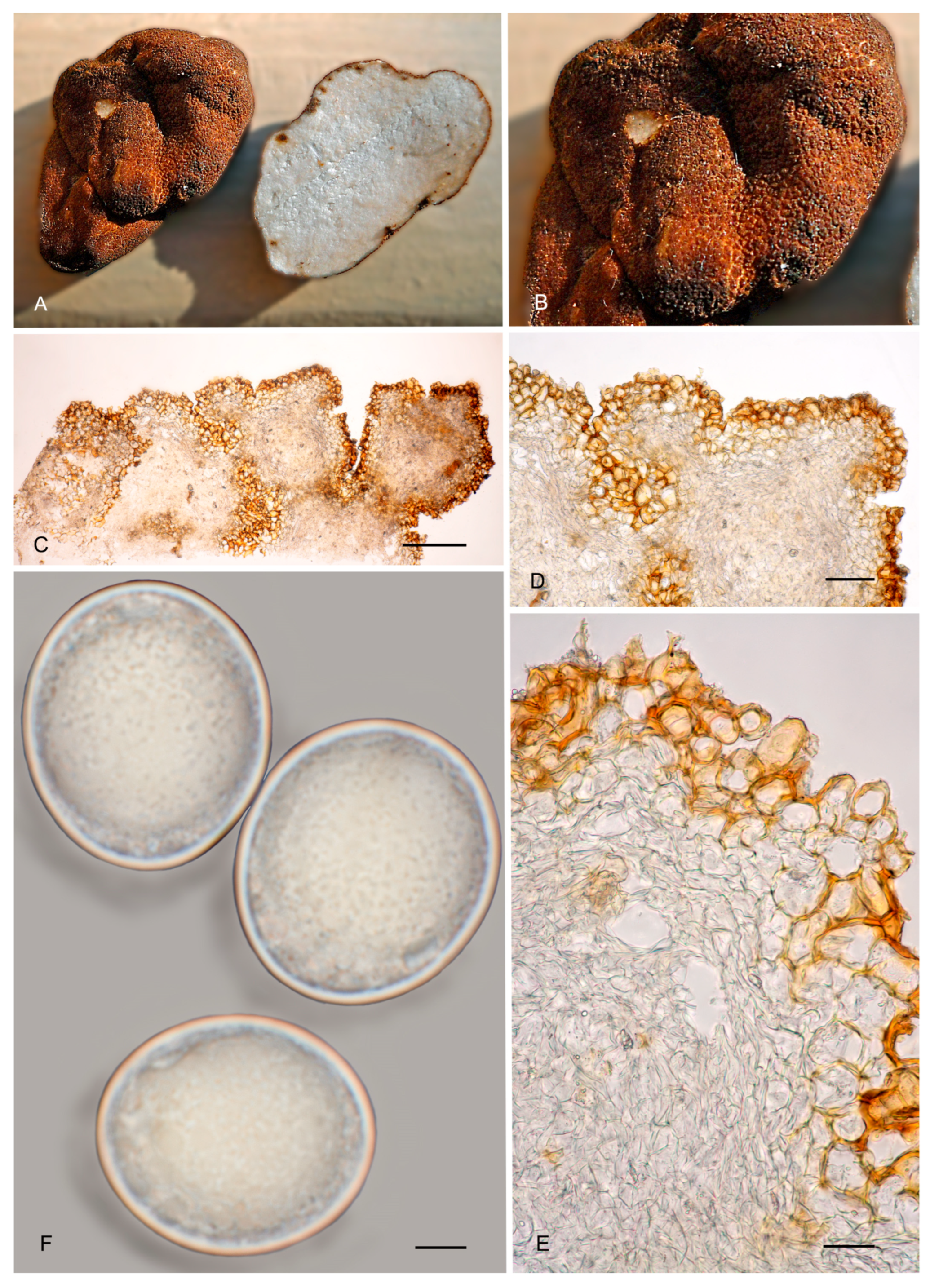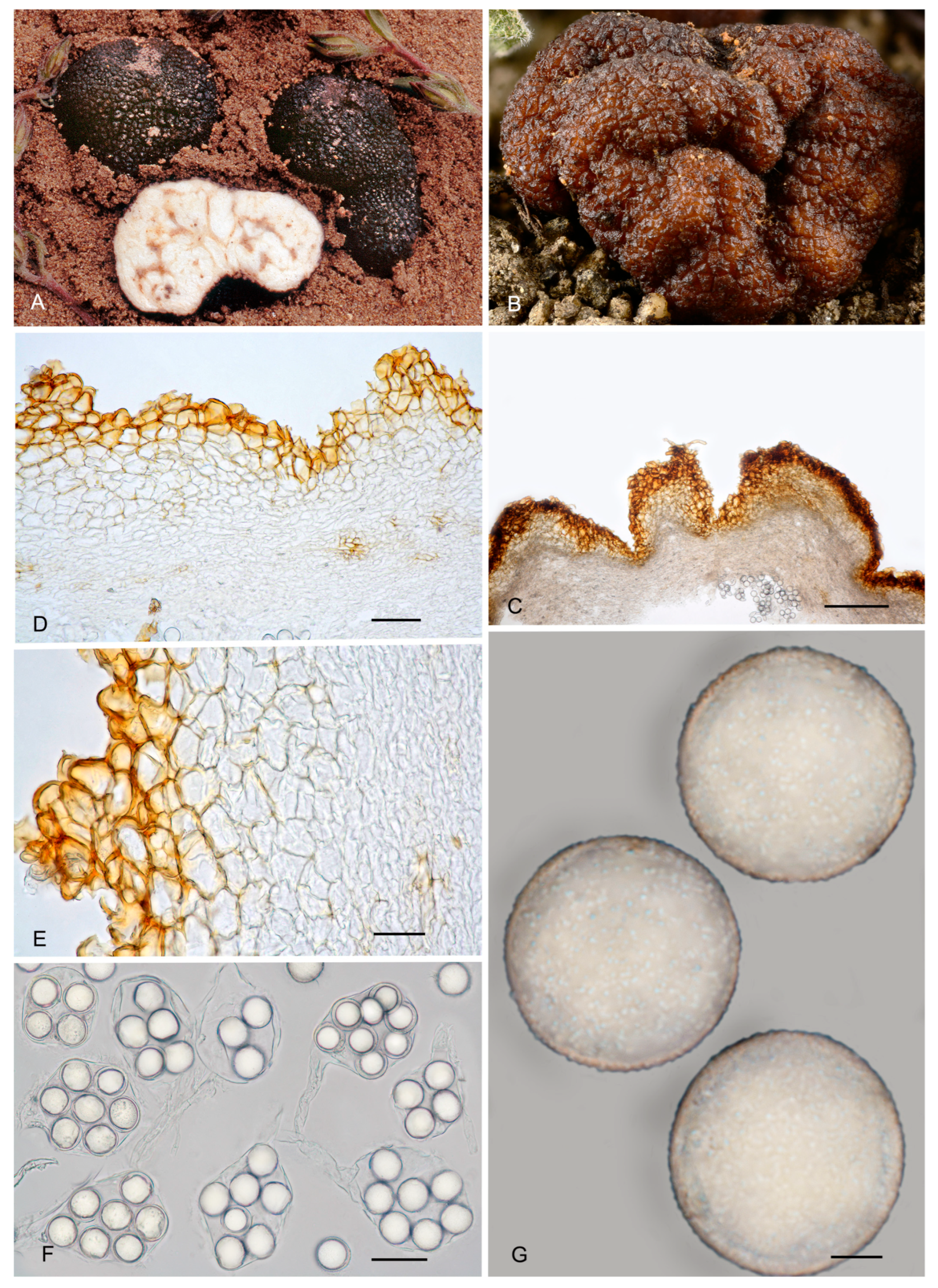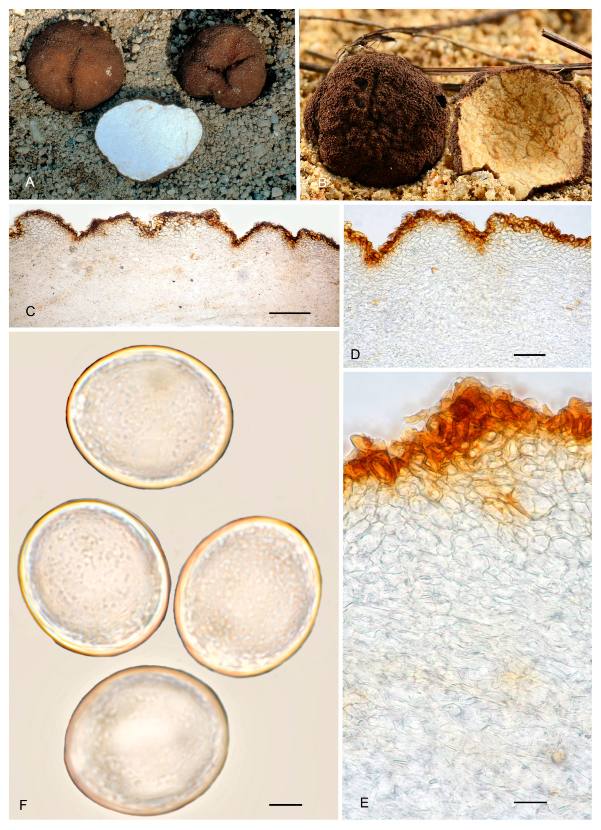 - Picoa microspora A. Paz, C. Lavoise & G. Pacioni, sp. nov. MB 859770. Figure 3, Figure 4 and Figure 5 and Figure 23.Etymology: From the ancient Greek μικρός (mikros) meaning small and σπορά (sporá) spora meaning seed, referring to the size of ascospores, the smallest of the known species of Picoa.Type: Egypt, Sidi Barrani, 28 February 1992, G. Pacioni & El Kholy (BCN-myc 3614 holotype, AQUI7051 isotype).Ascomata form subglobose stereothecia, 23 mm diam. on average, intensely reddish brown, slightly darkening when mature, with mycelial hairs present when young, sparse when mature. Peridium (surface) with irregular pyramidal warts, measuring 81–327.5 µm (height) × 235.5–578.5 µm (base), warts sometimes compound, with 2–3 edges, or simple. Medullary excipulum (peridium section) arranged in three layers: (1) outer layer very irregular in size, 22–53 µm thick, textura angularis, pseudoparenchymatous, made of subglobose to elongated sclerenchymatous cells, typically arranged in 2–3 rows at the apices of the warts and 1 row at the bases, 19.5–43.5 × 16.5–35.5 µm, Q = 1.11, slightly brown pigmented, walls up to 3.1 µm thick; the outer layer can be exceptionally formed of 4–6 rows of cells, 136.5–159.5 µm thick at the apices of warts where they are more irregular and sharp; (2) intermediate layer 39.5–98.5 µm thick, textura angularis, pseudoparenchymatous, made of hyaline, polyhedric to irregular sclerenchymatous cells, 11.5–27.5 × 13–31.5 µm, Q = 1.08, with walls up to 2.9 µm thick, interspersed with septate hyphae; (3) inner layer (transition toward the gleba) 136–267.5 µm thick, textura angularis, pseudoparenchymatous, made of irregularly polyhedric or puzzle-like cells, 4–12.5 × 6.5–17.5 µm, Q = 1.62, interspersed with bifurcated interwoven hyphae from the glebal tissue. Gleba composed of sterile zones with an intricate texture, made of elongated, bifurcate hyphae, with septa measuring 11.5 × 4 µm on average, as well as disordered fertile cells, with asci. Asci 142.5–143–145.5 × 66.5–68–70.5 µm, quickly evanescent, inamyloid, prototunicate, subglobose, peduncle 55–75 µm long (included in the ascus measurements), with a thin and simple wall, containing 4–8 ascospores. Ascospores broadly ellipsoidal, 20.5–21.5–22.5 × 18–18.5–20 µm, Q = 1.12–1.15, ornamented with isolated, thick granules, scattered on the rough spore surface.Ecology and Distribution: So far collected in Cyprus, Egypt, and Tunisia [13,33] in sandy, calcareous soils, in association with Helianthemum, in late winter and spring.Additional material studied: Cyprus, Mesaoria, near Helianthemum sp., 1 April 2009, Y. Yangou (GK3737*).Notes: Picoa microspora is characterized by (1) sparse mycelial hairs at maturity; (2) surface with mixed pyramidal warts (with 2–3 edges); (3) outer layer of the peridium irregular (1–6 rows of cells), pseudoparenchymatous, made of sclerenchymatous cells, with thin walls up to 3.1 µm thick; (4) inner peridium layer pseudoparenchymatous, made of polyhedric cells and interspersed elongated forked hyphae; (5) ascospores very small, less than 22.5 µm in length (the smallest in the genus Picoa), widely ellipsoidal, ornamented with coarse granules, scattered over the rough spore surface; (6) preference for sandy, calcareous soils; (7) probably associated with perennial species of Helianthemum; (8) apparently restricted to the Levant (Cyprus) and the African shore of the Mediterranean basin (Egypt, Tunisia). The size of the ascospores differentiates it from the other species, only P. puentei has more or less similar small ascospores, 22–23.5 × 19.5–21 µm µm (slightly wider than P. microspora), but P. puentei has an ectal excipulum covered with very irregular isolated granules and a plectenchymatous inner layer, with cells horizontally parallel toward the gleba, not intricate.