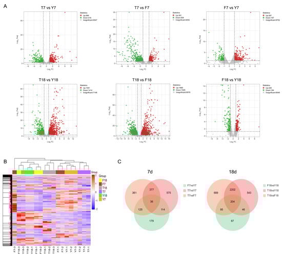 To assess dynamic changes in gene expression, differentially expressed genes (DEGs) were identified based on adjusted p-values (padj) and fold-change values, with thresholds set at padj ≤ 0.05 and |Log2(FoldChange)| ≥ 1. At day 7, compared with Y7, T7 contained 1102 DEGs (686 upregulated and 416 downregulated), and F7 contained 454 DEGs (287 upregulated and 167 downregulated). Compared with F7, T7 exhibited 899 DEGs (391 upregulated and 508 downregulated). At day 18, relative to Y18, T18 had 2995 DEGs (1581 upregulated and 1414 downregulated), while F18 had 412 DEGs (228 upregulated and 184 downregulated). Compared with F18, T18 displayed 3190 DEGs (1685 upregulated and 1505 downregulated). Volcano plots were generated to visualize the distribution of DEGs for each comparison (Figure 3A). Hierarchical clustering heatmaps grouped DEGs into distinct expression patterns (Figure 3B). Venn diagrams revealed overlapping genes across different cultivation days, with the day 18 samples exhibiting a higher number of DEGs, indicating that differences among strains were more pronounced at this stage (Figure 3C).