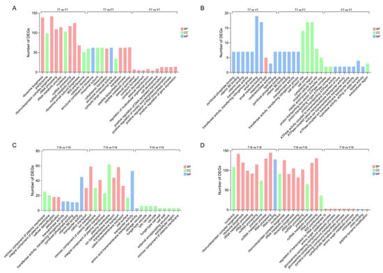 GO enrichment analysis of differentially expressed genes. (A) GO enrichment analysis of upregulated DEGs at day 7. (B) GO enrichment analysis of downregulated DEGs at day 7. (C) GO enrichment analysis of upregulated DEGs at day 18. (D) GO enrichment analysis of downregulated DEGs at day 18.