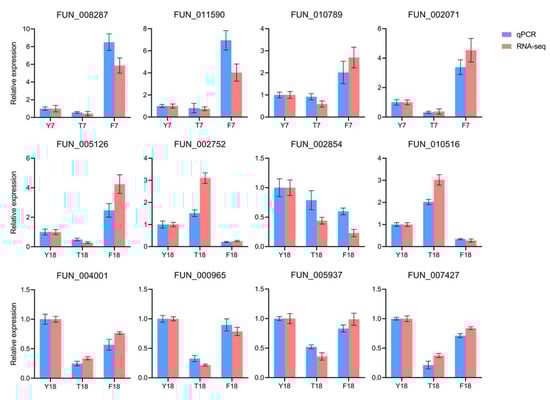 Twelve genes were selected for RT-qPCR analysis to validate the reliability of the transcriptome data. Bar plots comparing the expression differences in these genes as determined by RNA-seq and RT-qPCR are shown in Figure 7. Overall, the expression patterns of these genes were highly consistent with the RNA-seq results, supporting the reliability of the pathway-level conclusions drawn from the transcriptomic data.