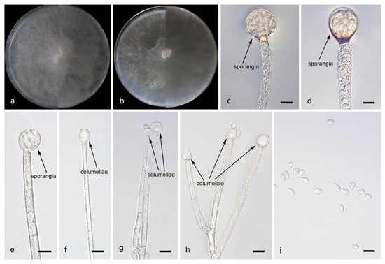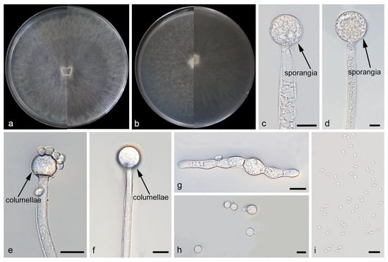 Morphologies of Mucor jujubinus ex-holotype CGMCC 3.29357. (a) Obverse and reverse of the culture on PDA; (b) obverse and reverse of the culture on MEA; (c,d) sporangia; (e–g) columellae; (h) rhizoids; and (i) sporangiospores. Scale bars: (c–i) 10 μm.