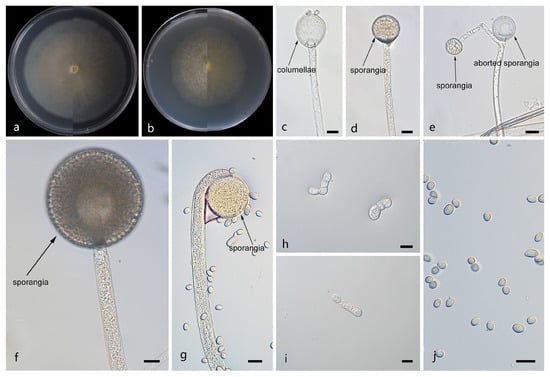 Morphologies of Mucor macrosporangium ex-holotype CGMCC 3.29358. (a) Obverse and reverse of the culture on PDA; (b) obverse and reverse of the culture on PDA; (d,f,g) sporangia; (c) columellae; (e) aborted sporangia; (h,i) chlamydospores; and (j) sporangiospores. Scale bars: (c–j) 10 μm.