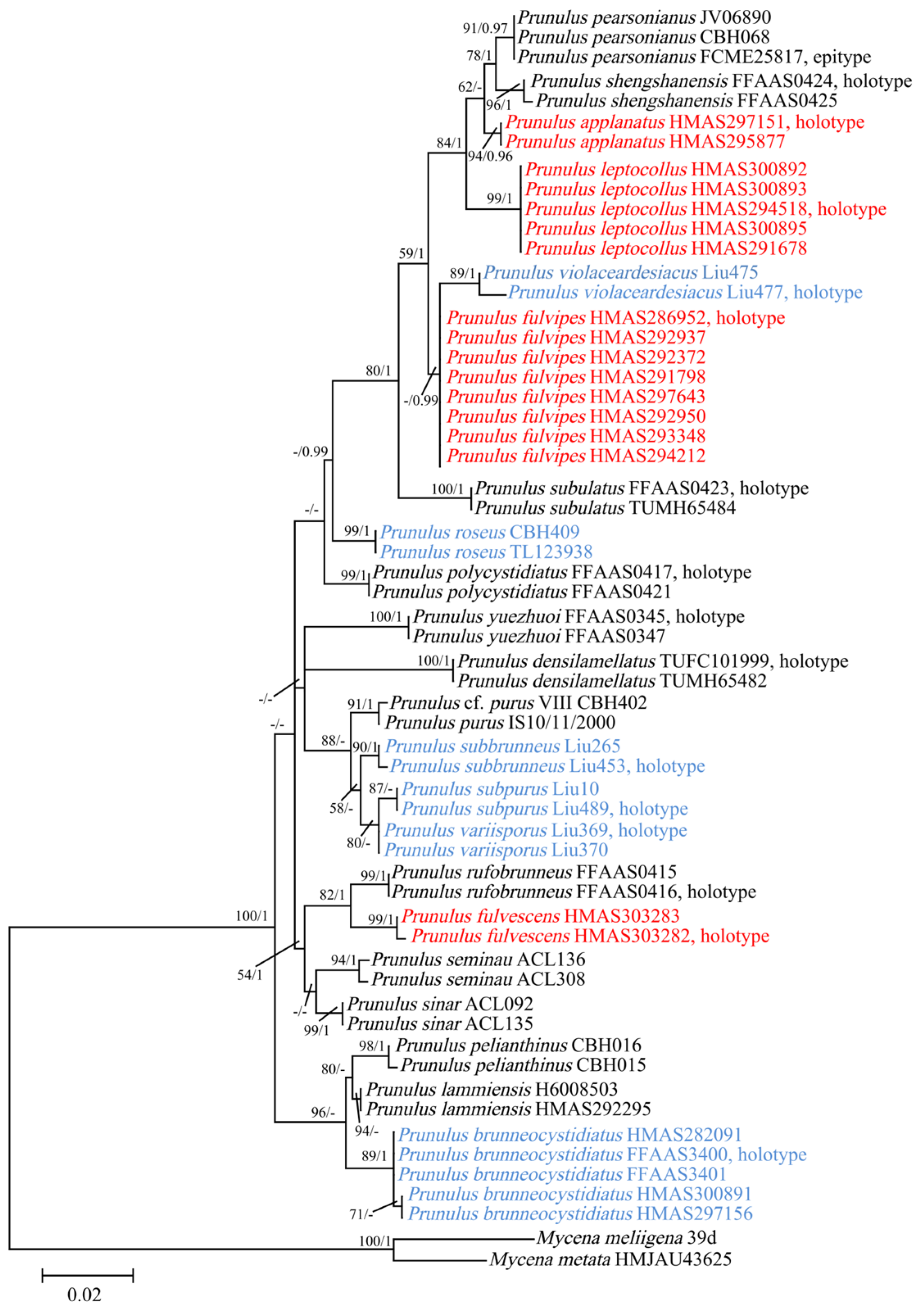 3.2.4. Prunulus fulvipes Rui Wang bis, Ke Wang, H.F. Liu, Di Liu & T.Z. Wei, sp. nov. Figure 6 and Figure 7