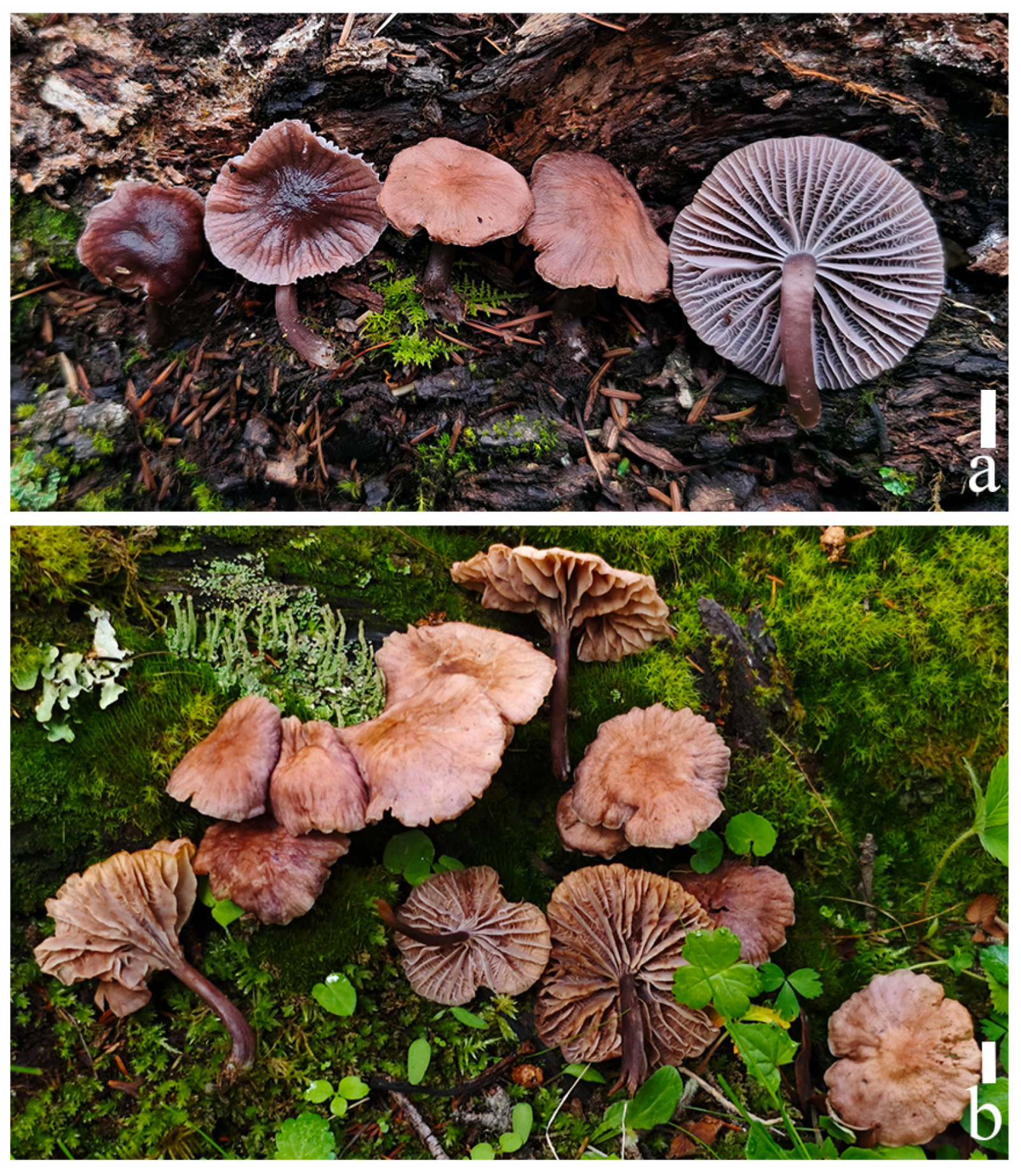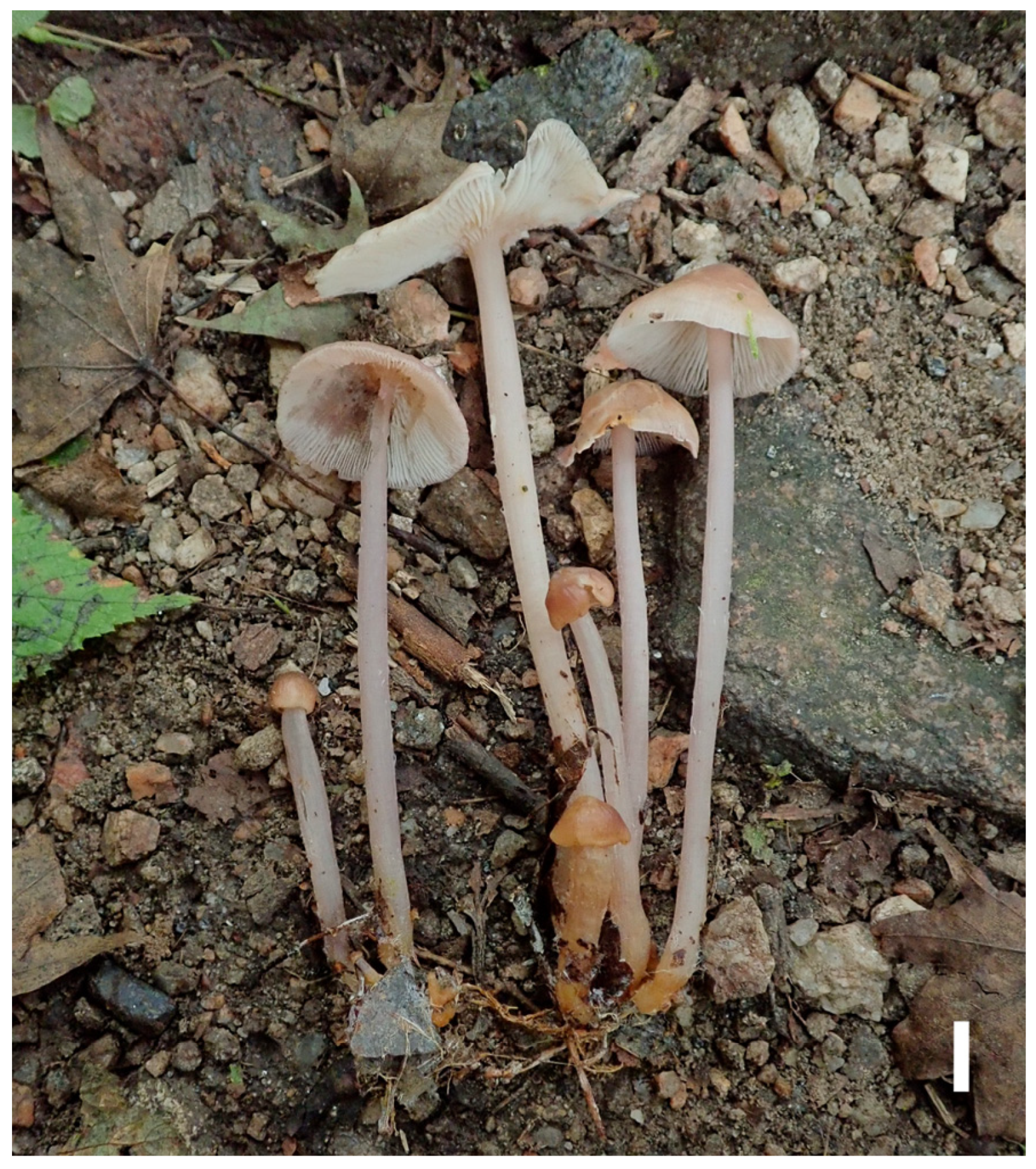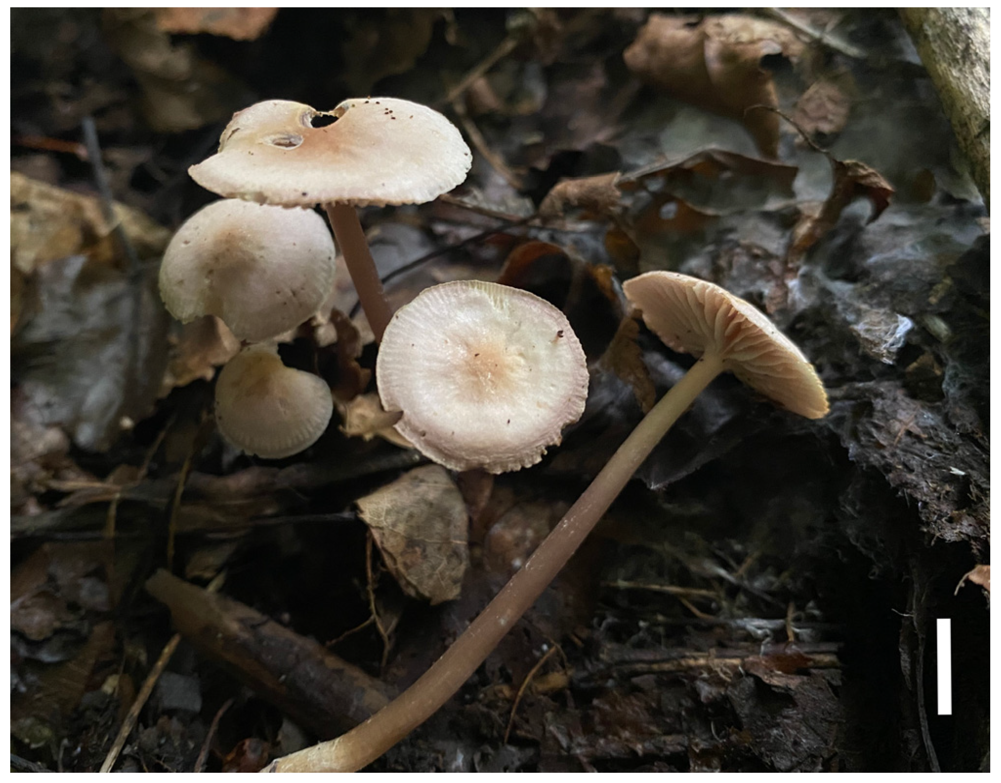 - Liu, Z.W.; Na, Q.; Cheng, X.H.; Wu, X.M.; Ge, Y.P. Mycena yuezhuoi sp. nov. (Mycenaceae, Agaricales), a purple species from the peninsula areas of China. Phytotaxa 2021, 511, 148–162. [Google Scholar] [CrossRef]