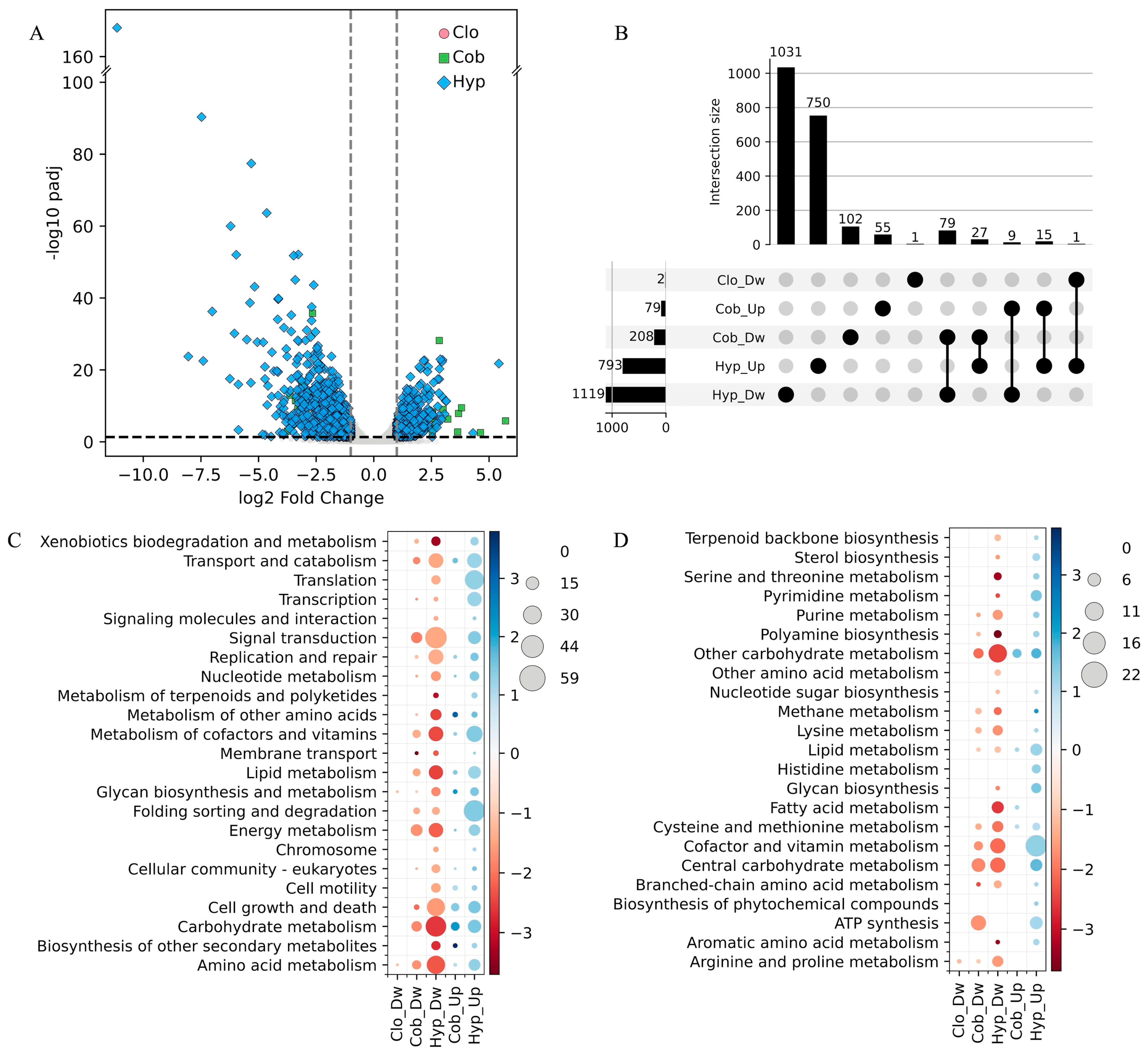 | Gene | Protein (KEGG Module Level 2) | log2 | padj | log2 | padj | log2 | padj | log2 | padj |