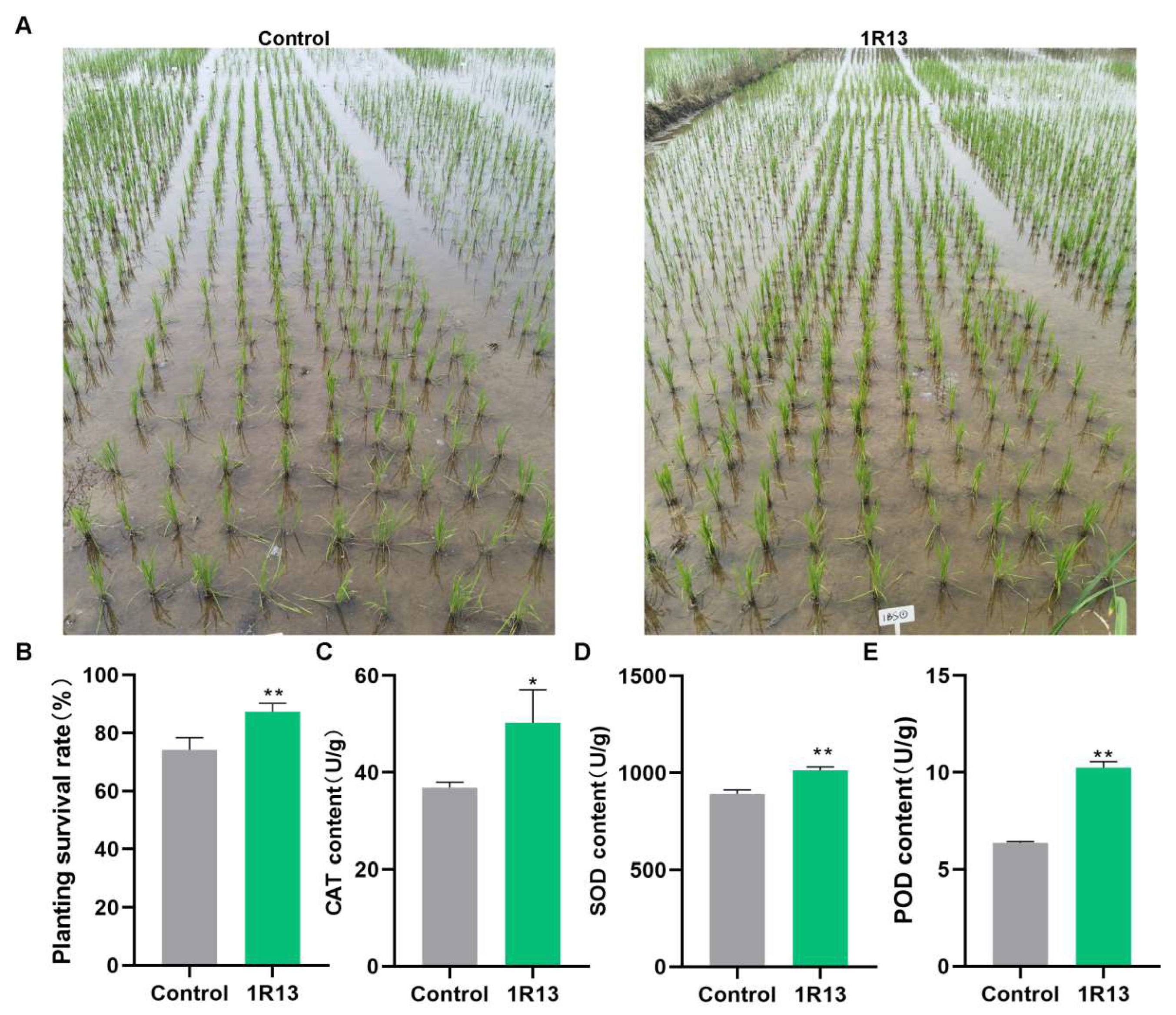 3.6. The Influence of Bussabanomyces oryzae on Rice Seedlings in Fields