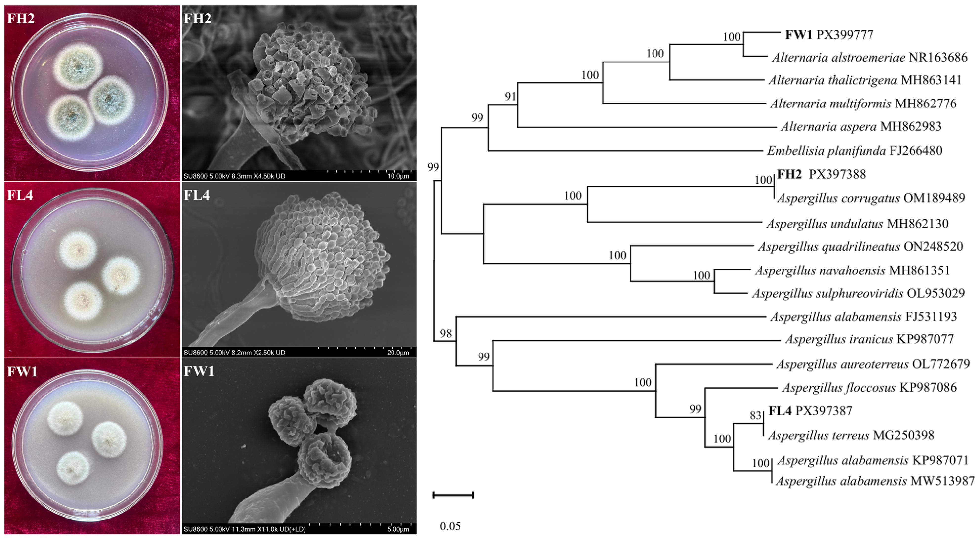 | Aspergillus corrugatus FH2 | Aspergillus terreus FL4 | Alternaria alstroemeriae FW1 | |