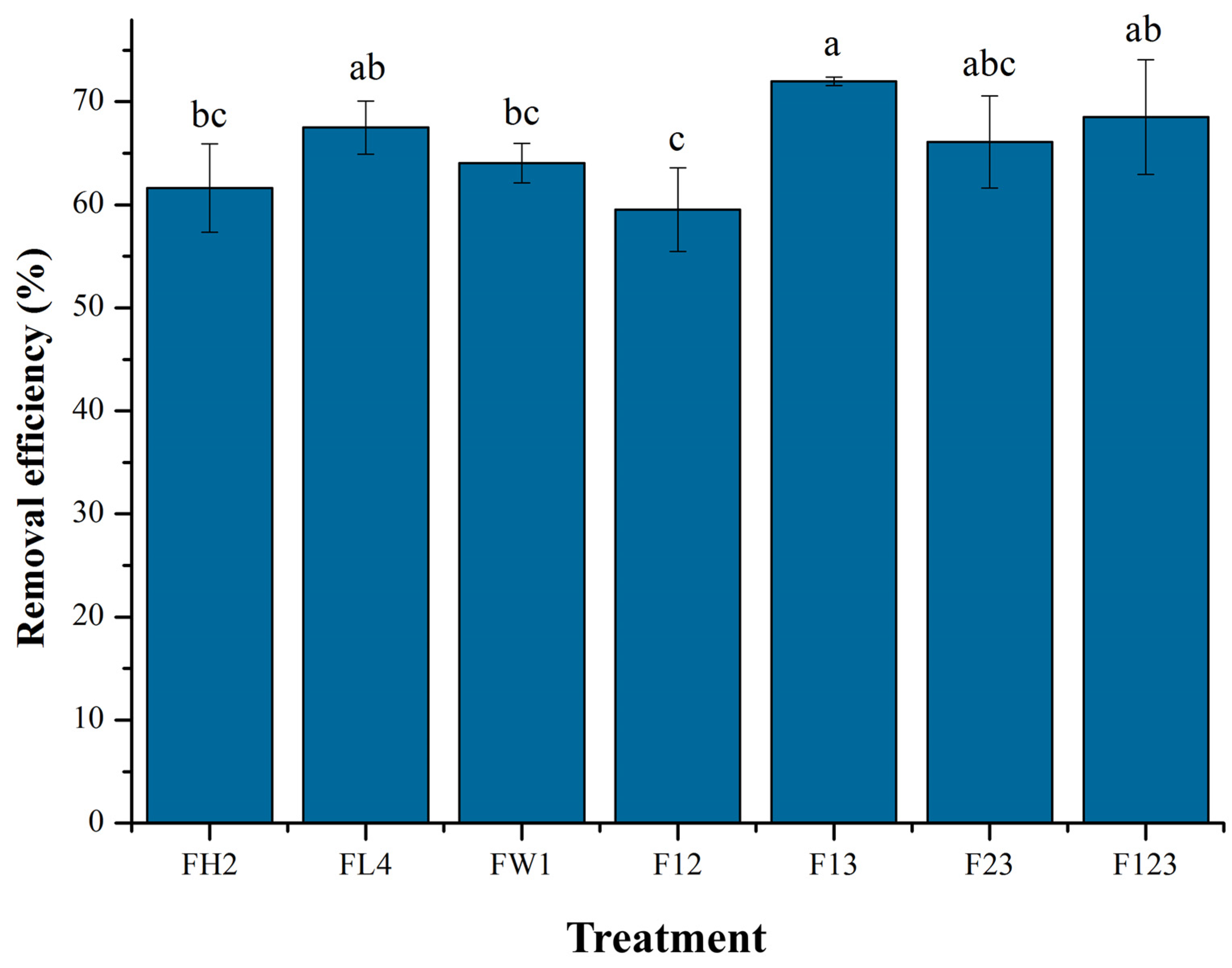 | F13 | 13 ± 1 e | 87.4 | 55 ± 3 f | 92.0 | 128 ± 7 c | 69.5 | 88 ± 2 b | 27.3 |