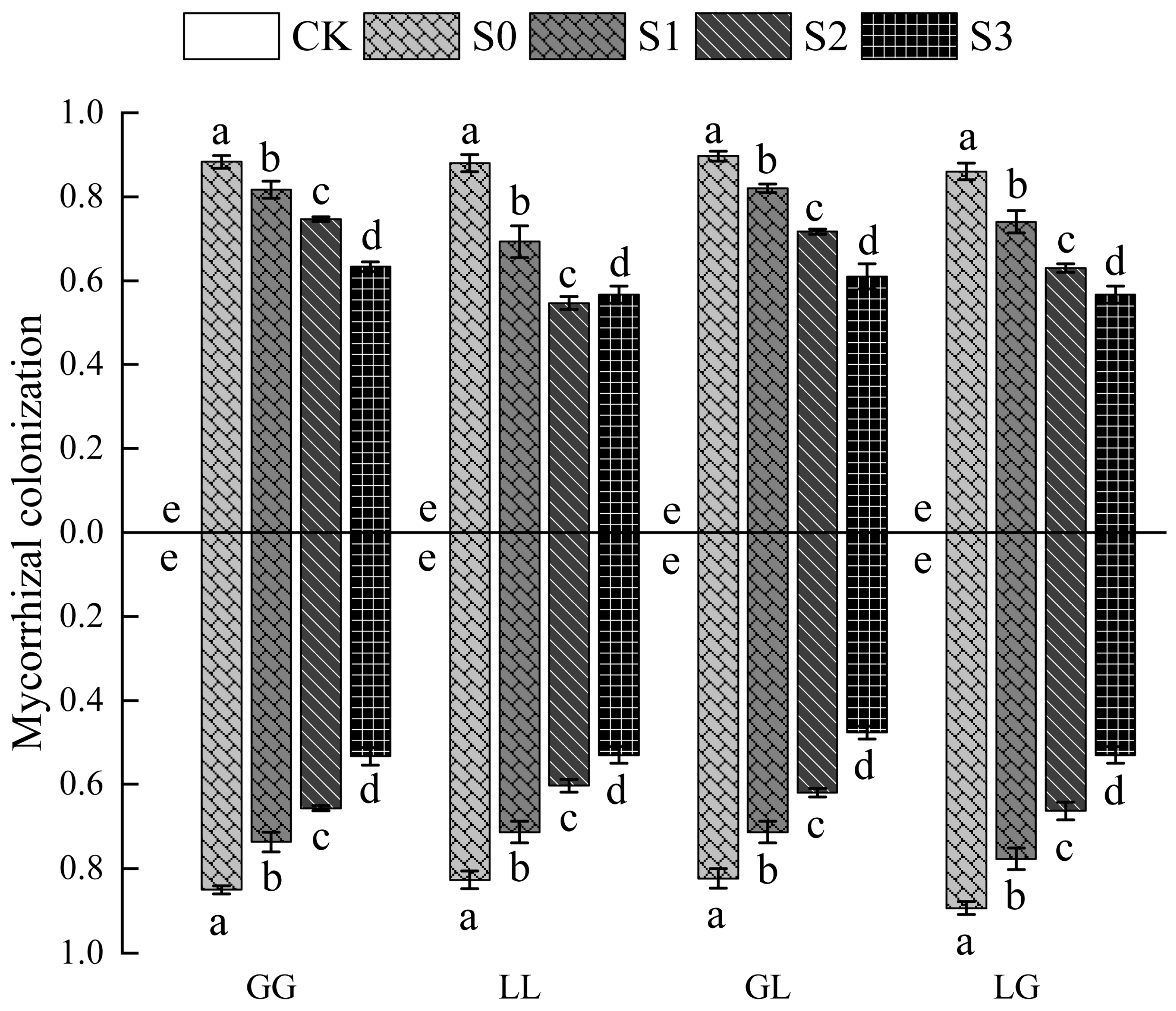 | Mycorrhizal colonization rate | 1727.786 *** | 13.709 ns | 2.165 * |