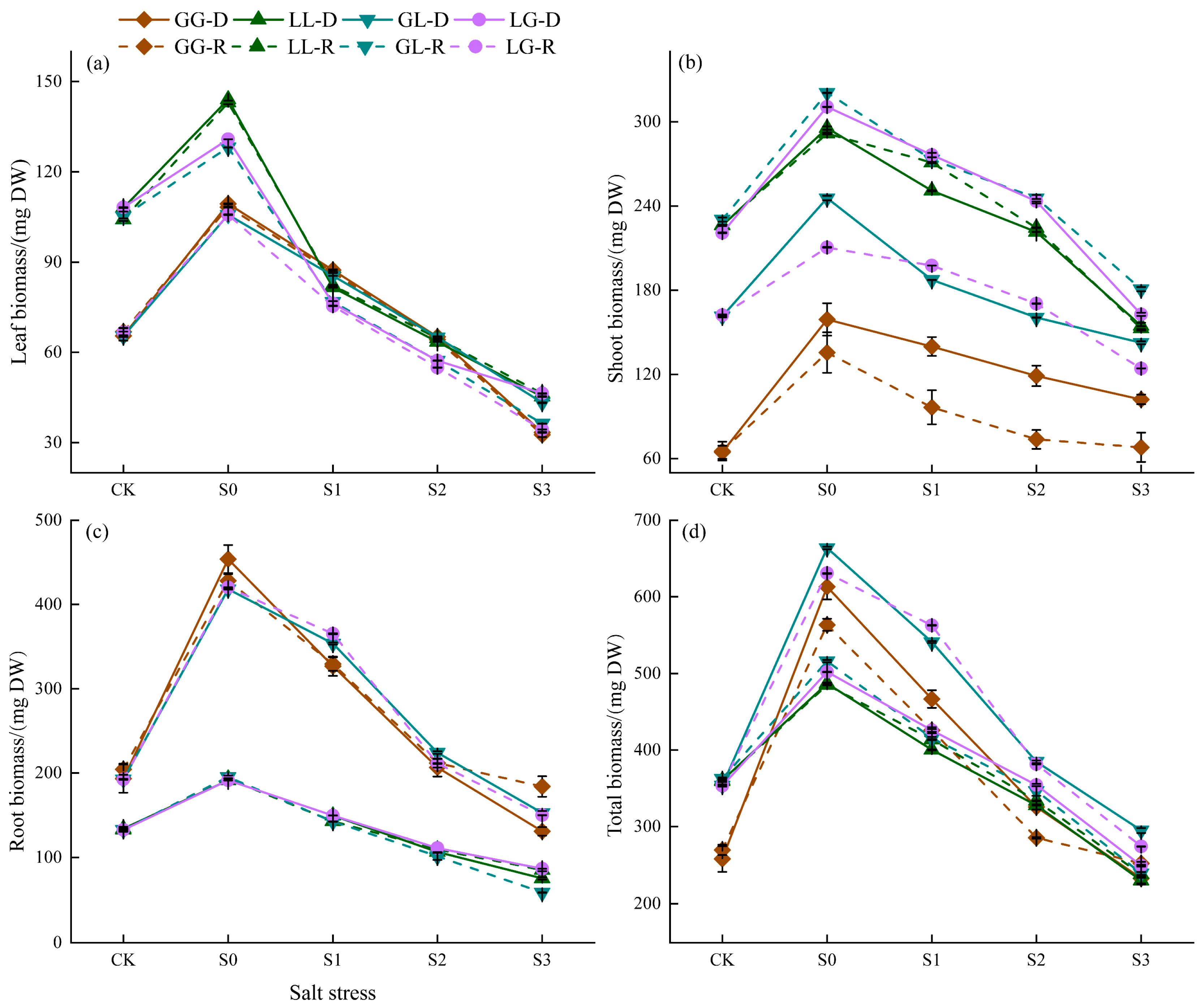 3.2. The Impact of Salt Stress on Plant Biomass