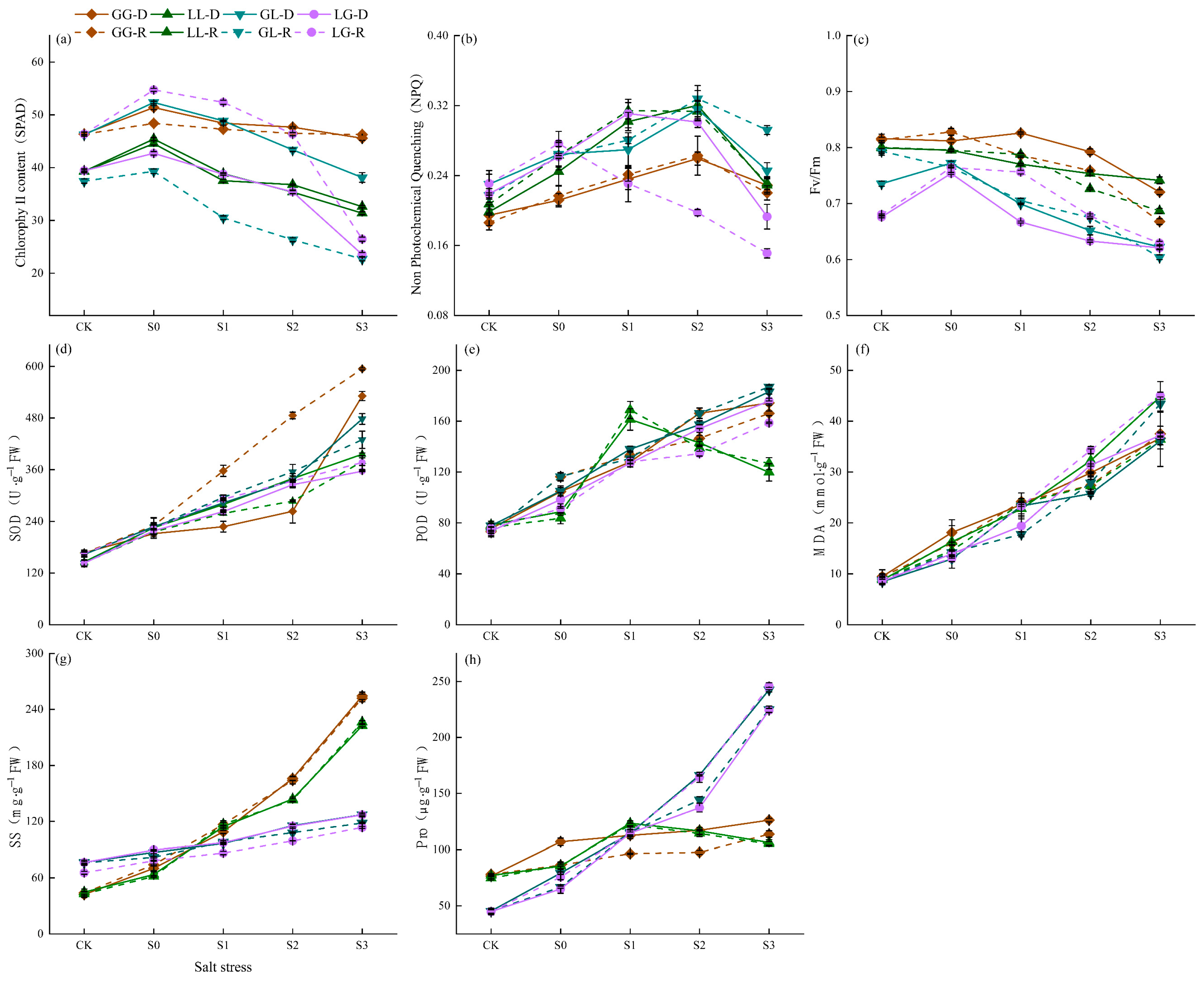 2.4.2. Antioxidant Enzyme Activities, MDA, and Osmolytes