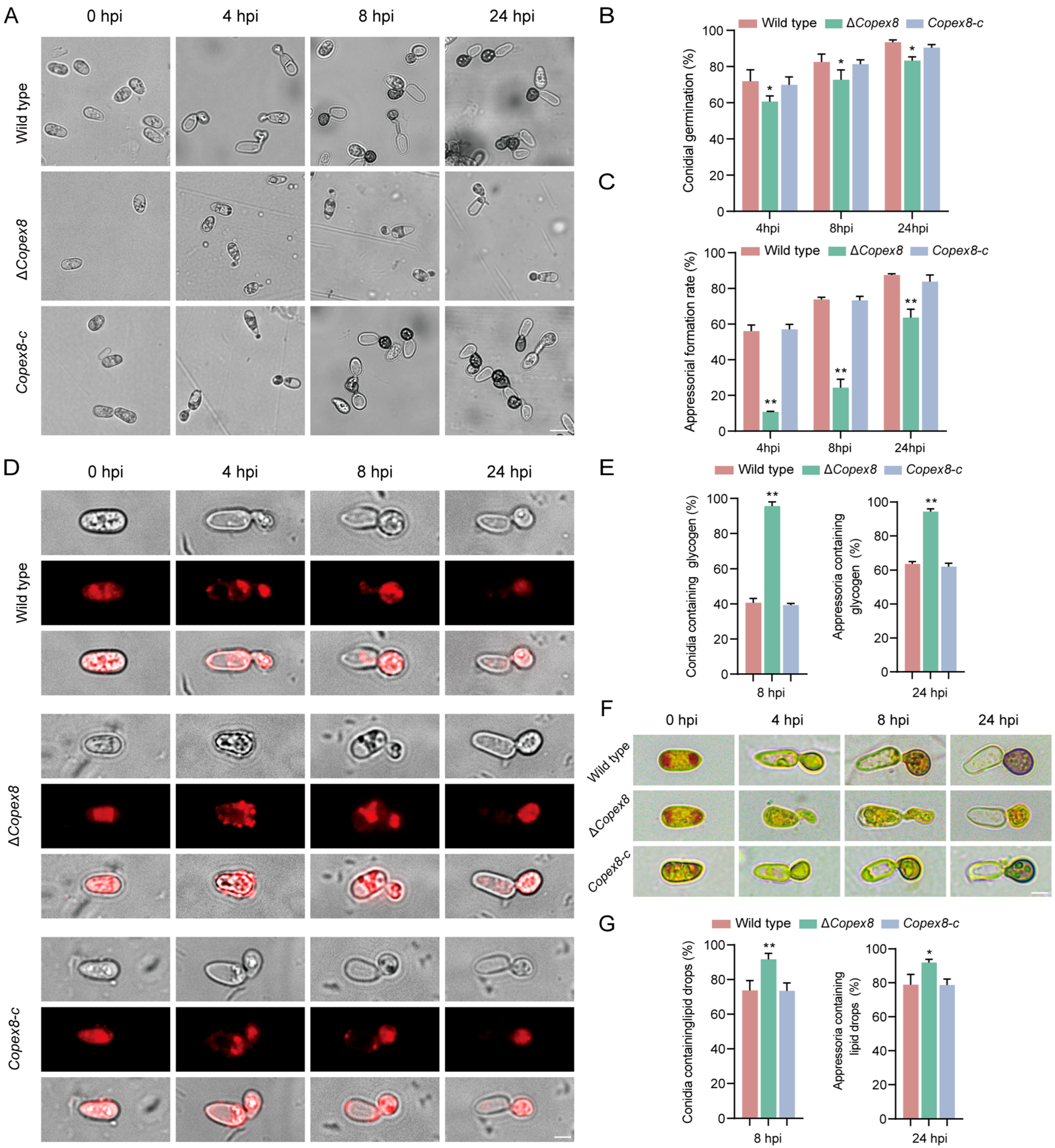 3.5. CoPEX8 Is Essential for Appressorium Formation and Maturation
