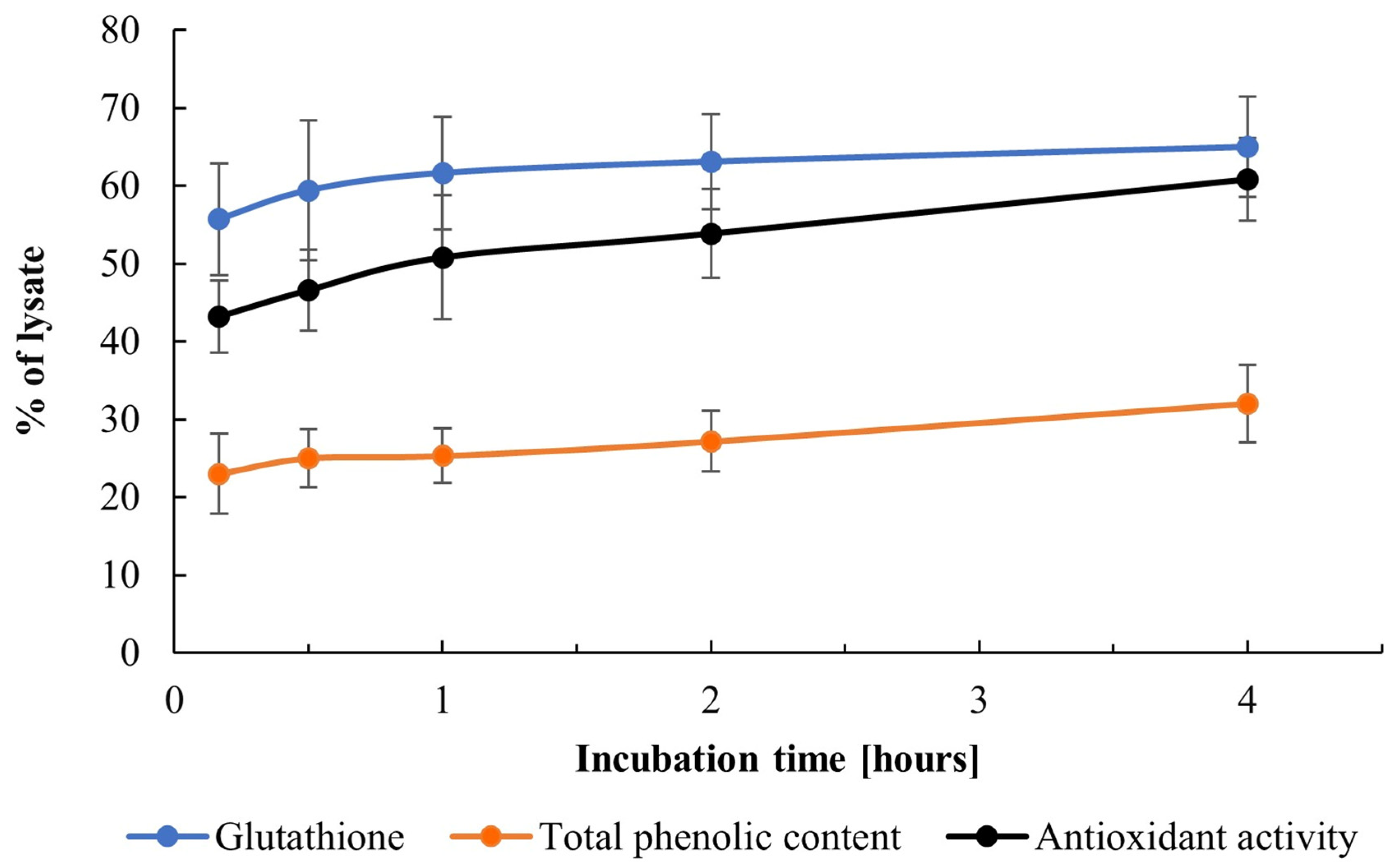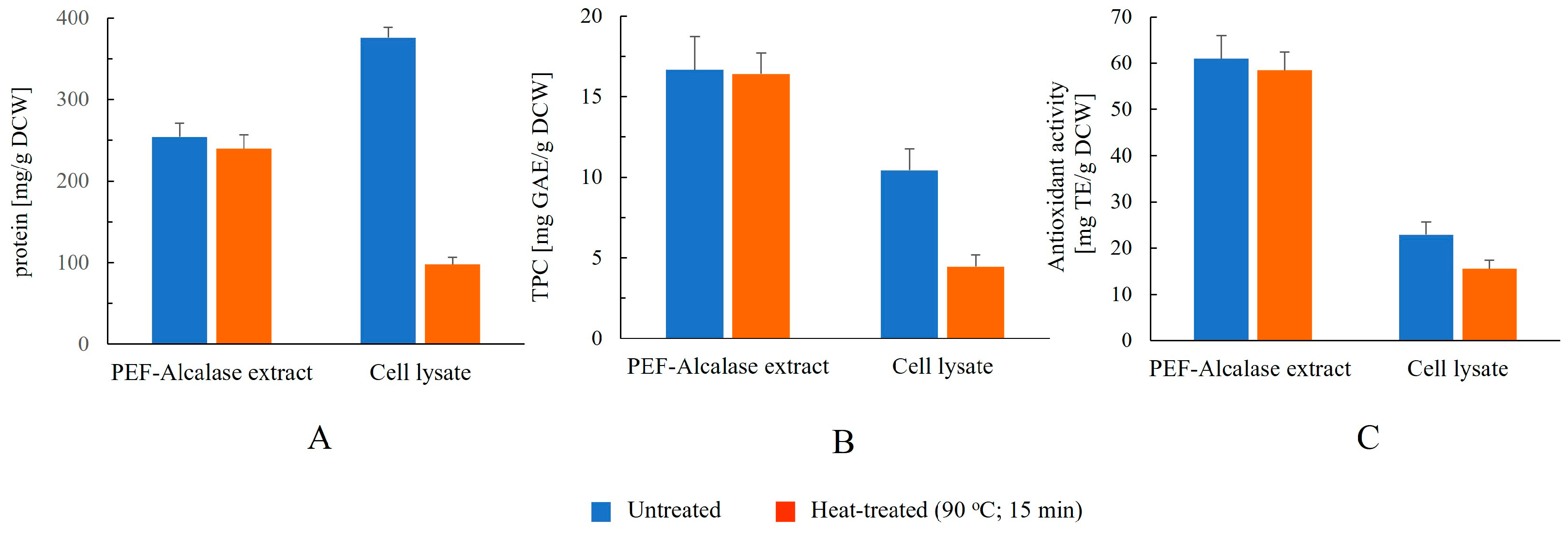 3.2.5. Effect of Heat Treatment on Protein, Total Phenolic Content, and Antioxidant Activity in Extracts and Cell Lysates