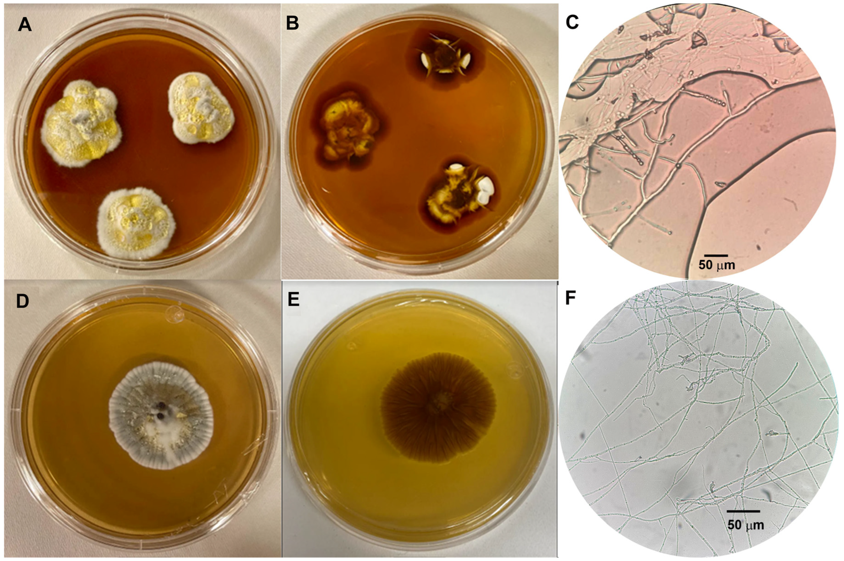 2.2. Fungal Isolation and Macro and Micromorphological Identification