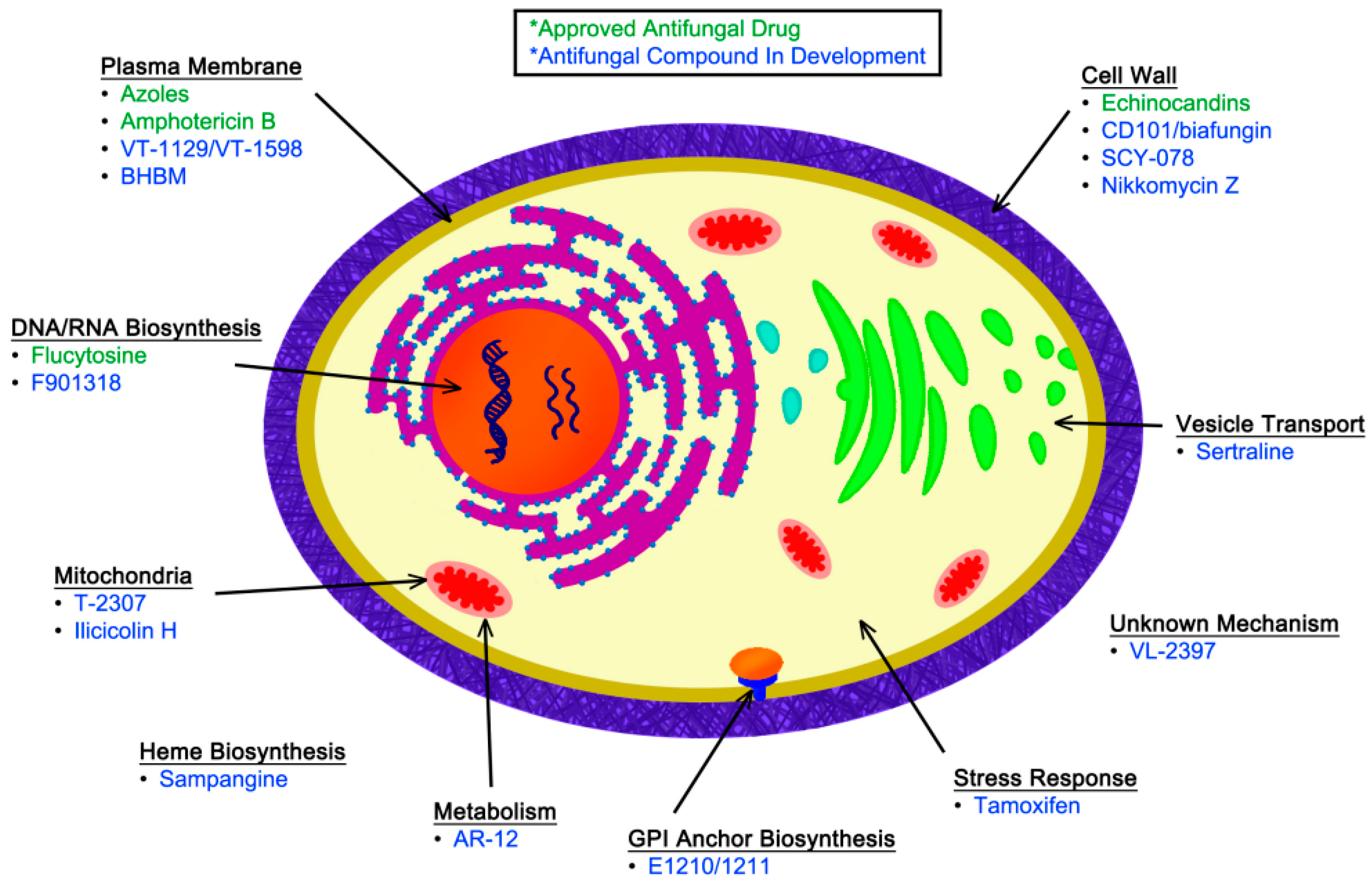 This diagram of a fungal cell indicates the sites of action for currently approved antifungal drugs (green) as well as other agents in various stages of development (blue).