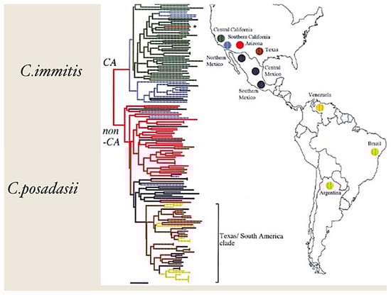 Geographic distribution and phylogeny of C. immitis and C. posadasii. This figure is adapted from reference [1]. CA refers to California (C. immitis) and non-CA refers to non-California (C. posadasii). The color coding is based on phylogenetic relatedness [1]. The publisher has granted the rights for reproduction of this figure.