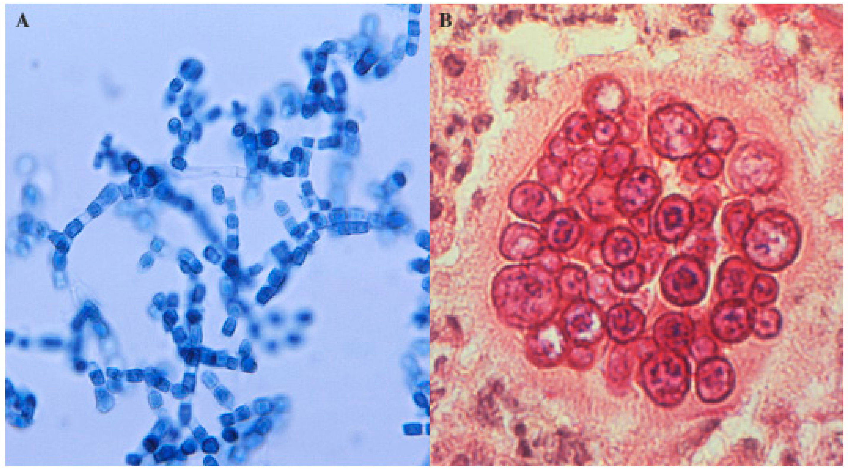 Coccidioides spp. arthroconidia and spherules. (A) Arthroconidia within hyphae (lacto-phenol cotton blue preparation) (B) Spherule containing endospores in tissue (periodic acid—Schiff stain). The images were obtained from the CDC (http://phil.cdc.gov/phil/details.asp). The images are in the public domain.