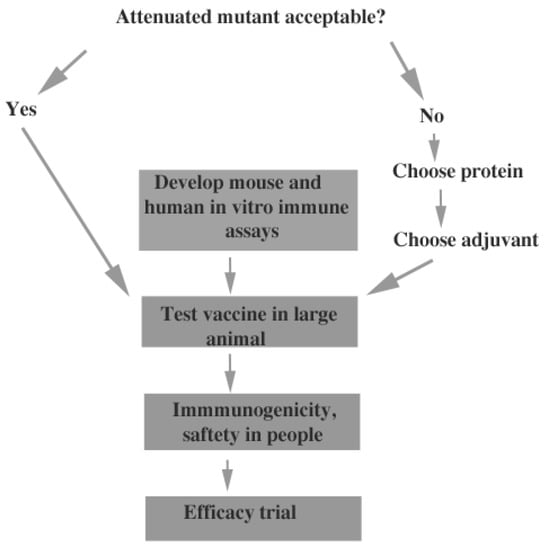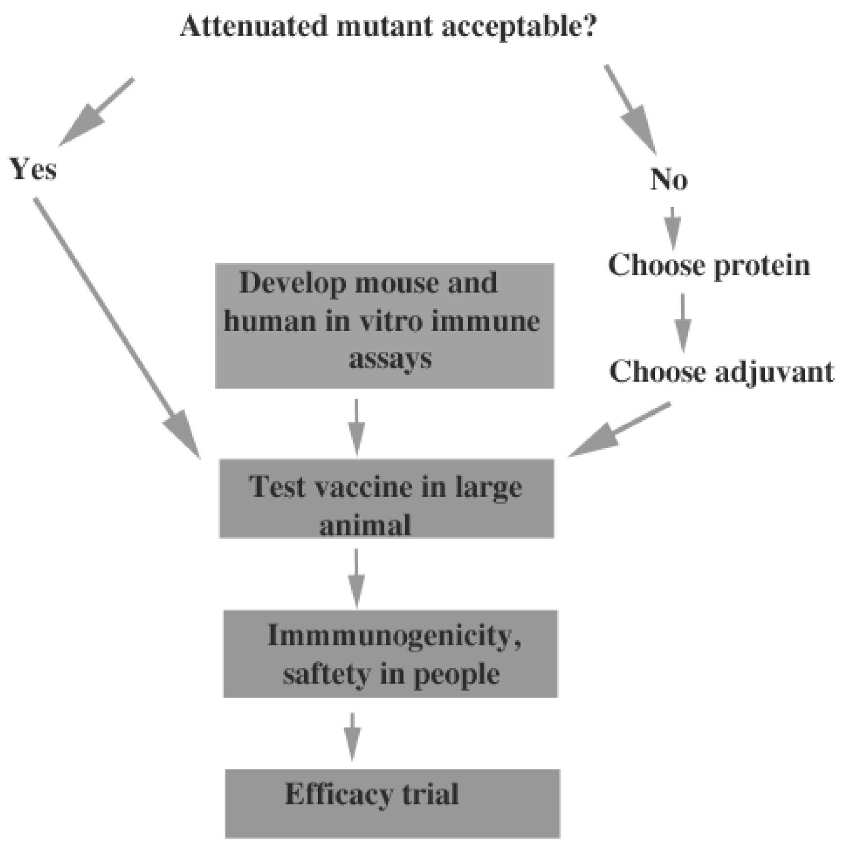 Figure 3 shows some of the tasks required to reach a human vaccine. The issue of acceptability of live, attenuated mutants as vaccines needs to be addressed by discussions with the FDA and pharmaceutical companies. A live attenuated vaccine would probably be more protective but much less acceptable than a subunit vaccine, particularly for an infection that is frequently asymptomatic. Perhaps development of a live attenuated vaccine for veterinary use would be a useful incremental approach, since some species of pet animals are susceptible to infection (farm animals can also be infected but do not develop serious disease) [50]. If acceptance of vaccination with live mutants seems unlikely, more developmental studies of recombinant protein vaccines and protein/adjuvant combinations need to be done. This would require comparison of candidate proteins, or combinations of proteins, with the same adjuvant in mice, and testing of the most promising protein or combination of proteins, with a variety of adjuvants in mice. Once vaccine efficacy was established in mice, further testing in larger animals would be important. Non-human primates would be the best candidates but testing the vaccine in any animal other than mice would be useful. Regardless of the type of vaccine to be tested, validated immunologic tests in mice, larger animals and humans must be developed to ensure that vaccination elicits a robust immune response. One approach to this issue would be to compare the response to immunization with antigens that are protective to those that are not protective. Finally, testing of toxicity and immunogenicity in humans before an efficacy trial would be critical. No vaccine candidate, other than formalin-killed spherules, has been tested in humans because the vaccine work that has been done is at an early stage and these requirements have not been met.