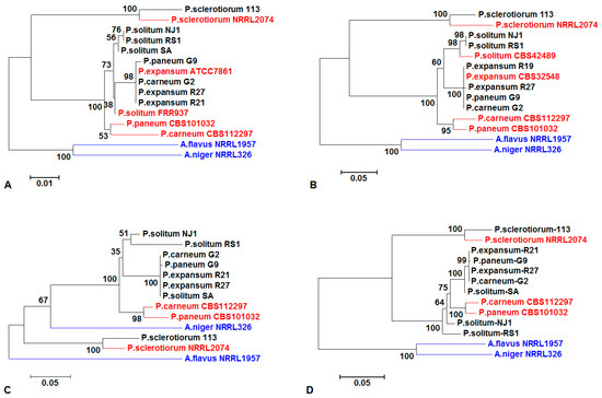 Penicillium spp. phylogenetic trees constructed using markers (A) ITS; (B) benA; (C) CaM; and (D) combinations of the two or three genes. Nine of our isolates and nine ex-types from NCBI GenBank were phylogenetically arranged using available marker sequences. The nine strains obtained from NCBI were P. expansum ATCC7861 = P. expansum CBS32548, P. carneum CBS112297, P. paneum CBS101032, P. sclerotiorum NRRL2074, P. solitum CBS42489 = P. solitum FRR937, A. flavus NRRL1957, and A. niger NRRL326. All the Penicillium species from GenBank are shown in red; the two Aspergillus species are shown in blue; our own sequenced Penicillium species are shown in black. Three genes were used to perform sequences analysis in Figure 1D, except only two genes (ITS and CaM) were used in P. expansum R21 and P. solitum SA analysis.