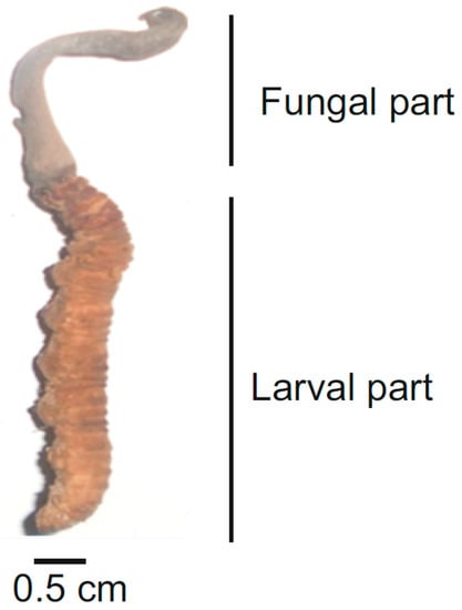 Different strains of Cordyceps sp. harbored in different geo-environments produce variable cultural characteristics with varying therapeutic properties []. The size of the colony, shape and color may vary widely with different strains when observed on artificial solid media and they do not vary with age []. Laboratory cultivation of OS is difficult, while the cultivation of other species of Cordyceps such as C. militaris has been tremendously successful [,]. The major bottleneck for the artificial cultivation of OS is the low fungal infection rate of artificially inoculated insects [,]. In some extreme conditions, when successful inoculation is achieved, the mycelium of OS can be grown to about a 1 cm diameter after two weeks []. Even though difficulties in growing OS in artificial media persist, an increasing number of pseudo-Cordyceps products derived from mycelial cultures of anamorphic forms of these fungi have become commercially available []. To meet an increasing demand and to diminish the prevailing huge pressure on natural resources, mass cultivation of living strains of Cordyceps has been successfully performed at industrial levels using bioreactor technology []. The cultured mycelium of OS is transparent to translucent, in an aggregation, mostly in irregular blocks []. Most often, difficulty in identifying actual relationships between Cordyceps anamorphs and species persists because some species produce anamorphs readily in nature but not in culture []. However, this could now be circumvented using robust molecular biology approaches. Although natural OS specimens harbor significant pharmaceutical properties that have been used in traditional Chinese medicine for many years, the commercial cultivation of this fungus on moth larvae to produce fruiting bodies has not been successful so far.
