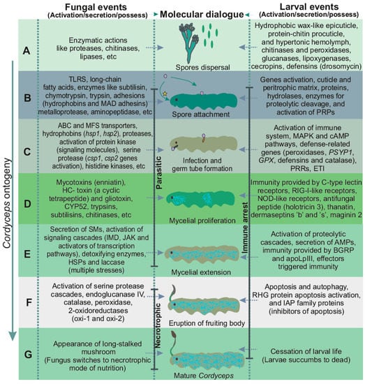 Fungal assault on insect larvae. (A,B) Spore landing and attachment: Sticky conidia are attached to larval cuticle by adhesins; (C) Infection and formation of germ tube: germination of conidia and extension of germ tube inside larval body; (D) Proliferation of mycelium: within larval body, hyphae extend continuously, giving rise to an extensive mycelial mass; (E) Extension of fungal mycelium: mycelium extends throughout larval body, colonizing every organ; (F) Eruption of fruiting body (ascocarp): soon after body gets colonized by fungal mycelium, it proliferates out from frontal cortex just between the eyes; (G) Mature Cordyceps: Cordyceps after erupting from larval head (larvae of Himalayan bat moth Hepialus armonicanus). * This entry-route of infection in Cordyceps is still unclear and thus requires further justification.