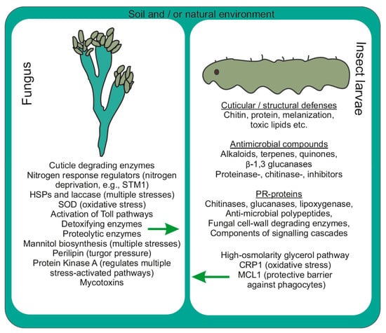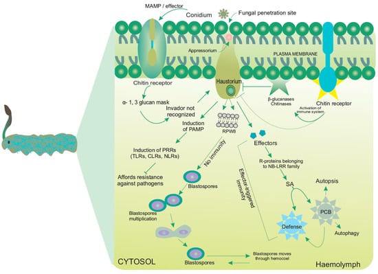 All insects are susceptible to fungal infections, but very occasionally do they contract viral and bacterial diseases. Insects’ larvae customize an entire battery of defenses, eventually activating their immune system to cope with highly bioactive fungal enzymes. Fungal infective arsenals produced by the active secretion of secondary metabolites (SMs) are programmed by the expression of endogenous genes, which ultimately breach the structural and cuticle barrier of insects. Cases of the active secretion of the insect-specific immune suppressants have also been traced in some fungi. However, larvae of host insects are endowed with an excellent surveillance system that enables the recognition of threats, signal transduction and the presence of other pathogen in their vicinity. The activation of several pathogenesis-related (PR) proteins has been identified with increased activity levels of chitinases and peroxidases during fungal infection in some aphids such as Smynthurodes betae and Slavum wertheimae []. The identification of 19 PR proteins families (such as chitinases, glucanases, lipoxygenase, fungal cell-wall degrading enzymes, etc.) endowed with anti-fungal and anti-insect activities has been achieved so far. The defense metabolites involve the active secretion of low-molecular-weight compounds, antimicrobial peptides and proteins that are antagonist towards fungus []. These SMs, along with antimicrobial peptides, are involved in either constitutive or induced resistance to act against the infective fungus; however, for the OS to get established within the larval body, the fungus needs to breach these larval secretions within the body. Nonetheless, the paucity of adequate knowledge on the mechanism of interactions between the larvae and fungus makes difficult the development of novel antiviral strategies.