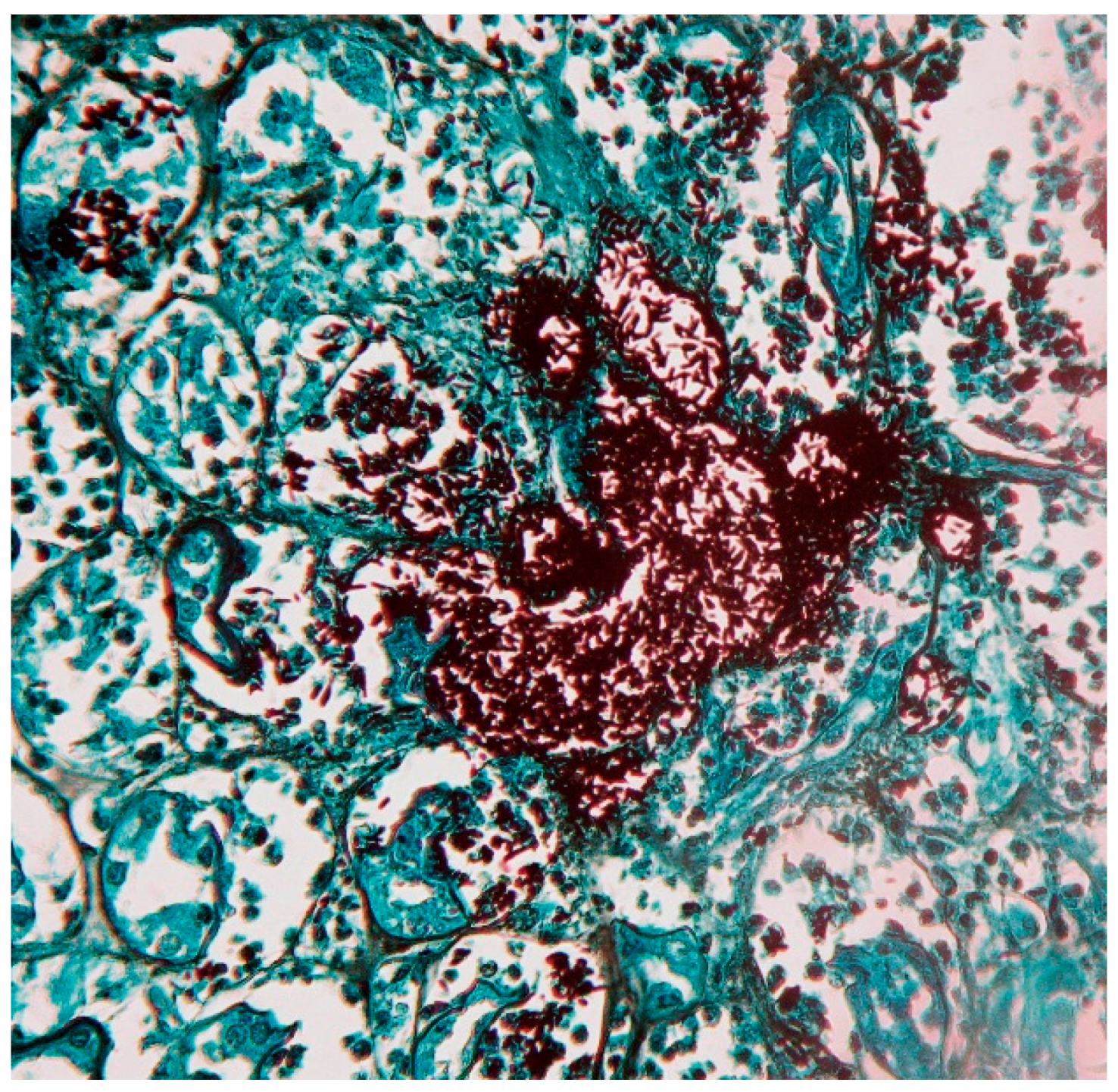 The histopathology offers a useful tool for cutaneous-lymphatic and cutaneous-fixed sporotrichosis diagnosis. Suppurative granulomatous pictures (84%) [70], where dispersed yeasts can rarely be seen and often with a radiated halo (asteroid bodies) are usually reported. In cases of cutaneous-disseminated and disseminated sporotrichosis, a similar histological distribution is seen as well as the presence of yeasts, depending on the patient’s immune status; some cumulus to large amounts of yeasts can also be noted, most of them are round or elongated; this becomes obvious with PAS and Grocott stains. It must be distinguished from histoplasmosis [3,70].