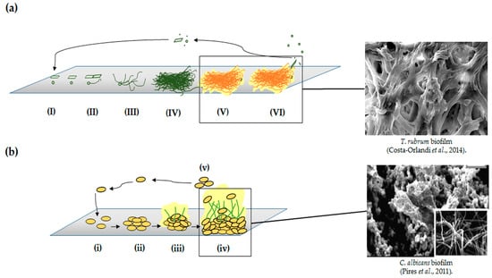 Models of biofilm development in filamentous fungi (a) and C. albicans (b). The stages of development are similar, although the morphology and number of stages are different. In the first model (a), six stages were proposed by Harding et al. []: (I) adsorption, (II) active attachment, (III) first formation of microcolony through germination and/or monolayer development, (IV) mycelial development, (V) biofilm maturation, and (VI) dispersion of conidia and/or arthroconidia. The second model corresponds to classical C. albicans biofilm development (b) which includes five stages, such as in bacteria: (i) adsorption, (ii) adhesion, (iii) microcolony formation, (iv) mature biofilm, and (v) dispersion. Modified from Harding et al. []. T. rubrum mature biofilm Costa-Orlandi et al. []; Pires et al. [].