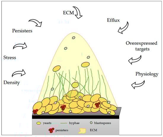 Planktonic cells generally depend on irreversible genetic changes to maintain a resistant phenotype, while biofilms persist because of their physical presence and population density, providing a nearly inducible resistant phenotype regardless of the defined genetic changes [,,]. Further, factors including pH, temperature, oxygen availability, and other environmental stresses alter the biofilm architecture and possibly antifungal susceptibility [].