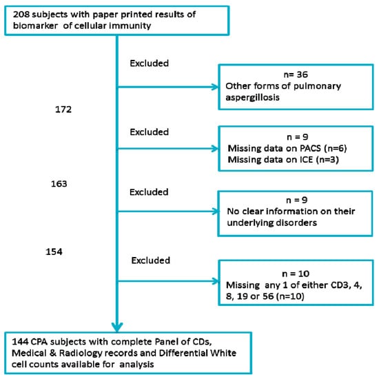 Only CPA patients with a complete panel of CD markers are included in the study. The other mandatory data required for inclusion were: (1) blood indices (total white cell, lymphocytes, neutrophils, and monocyte counts), (2) radiological information (computed tomography (CT) images and thoracic X-ray), (3) pertinent medical records indicating underlying pulmonary and systemic conditions, and (4) use of immunosuppressant medications. Only data available in written and electronic medical records was collected. Figure 1 shows the study schematic demonstrating the inclusion and exclusion criteria.