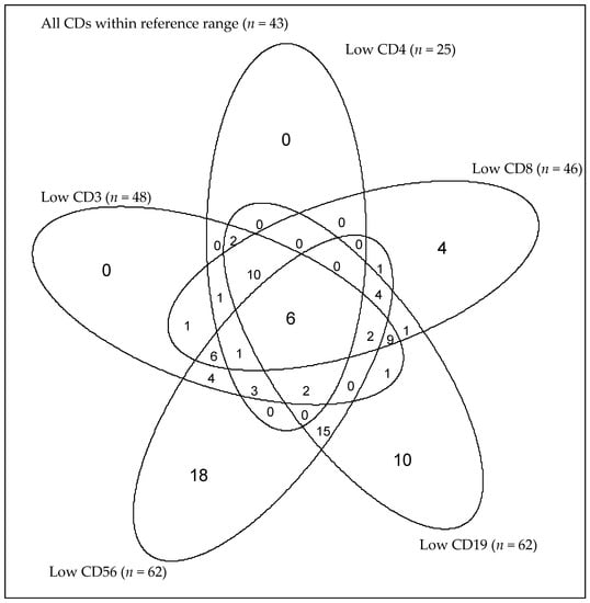 A Venn-diagram showing the distribution of all of the five CDs among the 144 patients. Six (4%) patients had lymphopenia in all the five CDs. Eighteen (13%), 10 (7%), and 15 (10%) patients had isolated CD56, CD19, and both CD56 and CD19 lymphopenia, respectively. Four (3%) patients had isolated CD8 lymphopenia. No patient had an isolated low CD4 or low CD3 count.