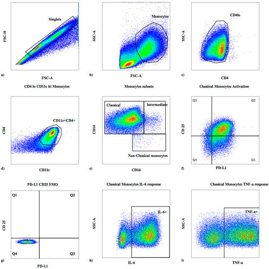 Flow cytometry gating strategy for monocytes. Analytic gating of flow cytometry data: (a) monocytes were identified from singlet cells; (b) monocytes were selected based on forward and side scatter; (c) cells expressing low levels of CD4 were selected; (d) cells co-expressing CD4loCD11c were then identified; (e) gating on monocyte subsets was performed with classical monocytes as (CD14hi++CD16−), intermediate monocytes as (CD14++CD16+), and non-classical monocytes as (CD14+CD16++); (f) classical monocyte activation shown by co-expression of programmed death ligand-1 (PD-L1) and CD25 is shown; (g) gating on the fluorescence minus one (FMO) controls is used to set gates for CD25 and PD-L1; (h) expression of interleukin (IL)-6 by classical monocytes following interferon (IFN)-γ stimulation for a representative patient; (i) expression of tumor necrosis factor (TNF)-α by classical monocytes following IFN-γ stimulation for a representative patient.