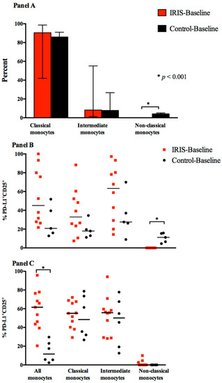 Monocyte Subsets and Activated (PD-L1+CD25+) Monocyte Subsets. (Panel A) displays total monocytes and monocyte subsets at CM diagnosis among participants who developed CM-IRIS (IRIS-baseline) vs. controls without IRIS (Control-baseline); (Panel B) displays activated monocytes and subsets at time of cryptococcal diagnosis from participants who subsequently developed CM-IRIS (IRIS-baseline) or matched controls on ART (Control-baseline); (Panel C) displays activated monocytes and subsets at IRIS-baseline and Control-baseline. Activation was measured by surface co-expression of programmed death ligand-1 (PD-L1) and CD25 (Interleukin 2 receptor α chain). Bars represent medians; * represents p < 0.001. Median values were compared using the Mann-Whitney test. Non-classical monocytes were absent at IRIS-baseline. Data is presented as percentage of monocytes but not percentage of total white blood cells, as the laboratory did not perform complete blood counts with every peripheral blood mononuclear cell (PBMC) isolation.