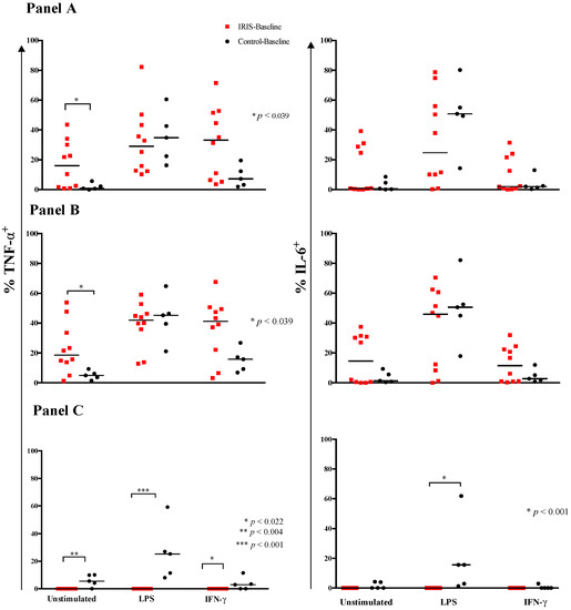 We determined the differential expression of these cytokines in the three monocyte subsets, including activated populations. Without stimulation, the frequency of TNF-α+ classical monocytes was higher at IRIS-Baseline compared with Control-Baseline (19% (IQR, 12–37%) vs. 5% (IQR, 3–8%); p = 0.039), whereas IL-6 expression did not differ (Figure 3 panel B). IL-6 expression by activated non-classical monocytes did not differ between the two groups, whereas TNF-α expression by the activated non-classical monocytes was lower at IRIS-Baseline compared with Control-Baseline, 0% vs. 6% (2–10%), p = 0.004 (Figure 3 panel C).