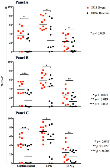 Comparison of IL-6 expression by monocyte populations at IRIS-Baseline vs. IRIS-Event among patients with paired samples. IL-6 intracellular expression was measured in total monocytes (Panel A); classical monocytes (Panel B), and activated (PDL1+CD25+) classical monocytes (Panel C) at IRIS-Baseline and IRIS-Event in 10 participants with paired samples. p values were determined by Wilcoxon rank sum test. At IRIS-Event, monocyte IL-6 expression was elevated compared to IRIS-Baseline from both unstimulated and IFN-γ-stimulated monocytes.