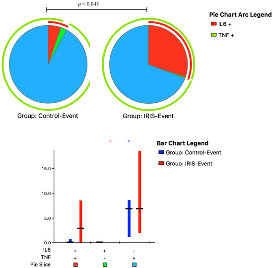 We assessed the monocyte functional phenotype following IFN-γ stimulation at IRIS-Event compared with Control-Event by measuring the possible combinations of 1- or 2-cytokine responses. At IRIS-Event, the immune responses were characterized by significantly elevated dual-function monocytes producing IL-6- and TNF-α, with a frequency of 39% (IQR, 20–61%) compared to 8% (IQR, 3–10%) at Control-Event, p = 0.045 (Figure 5).